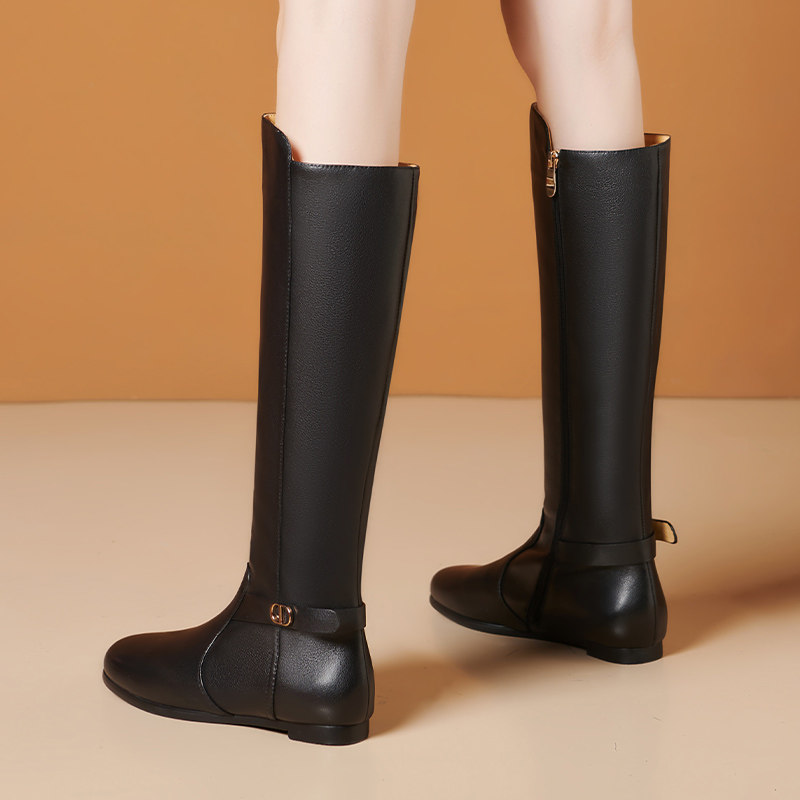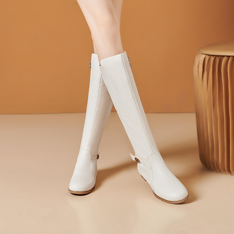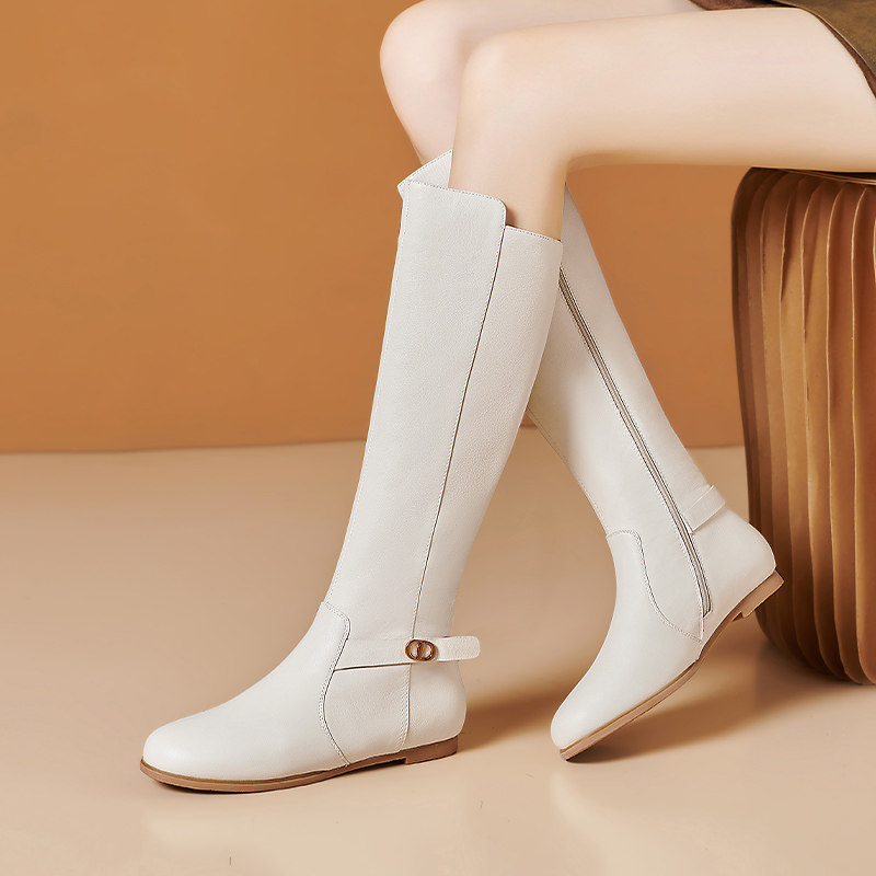 长筒靴女新款圆头平底米白色长靴真皮高筒靴女靴显腿长大码女靴子