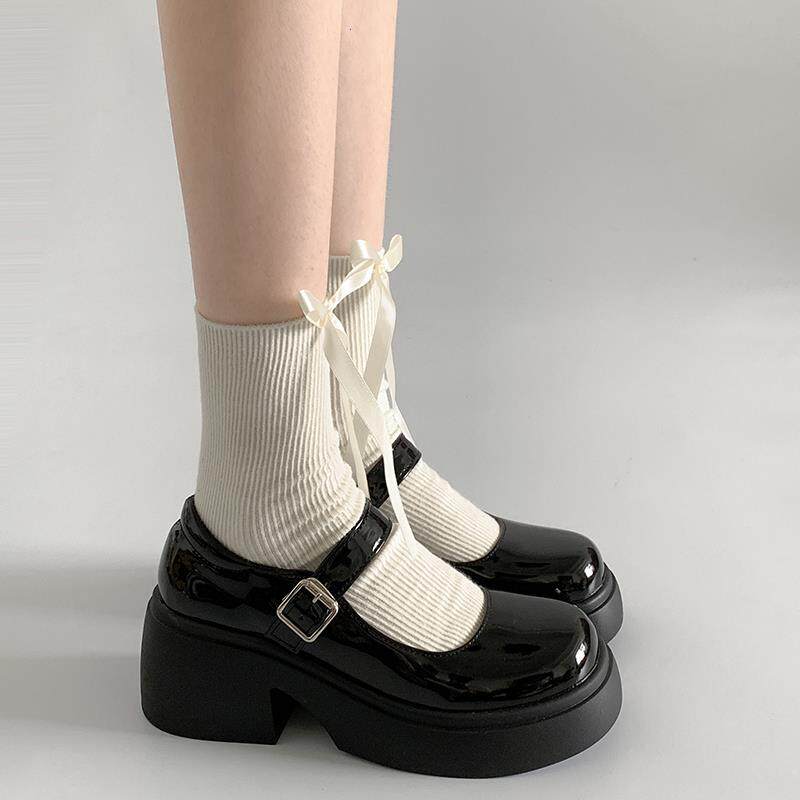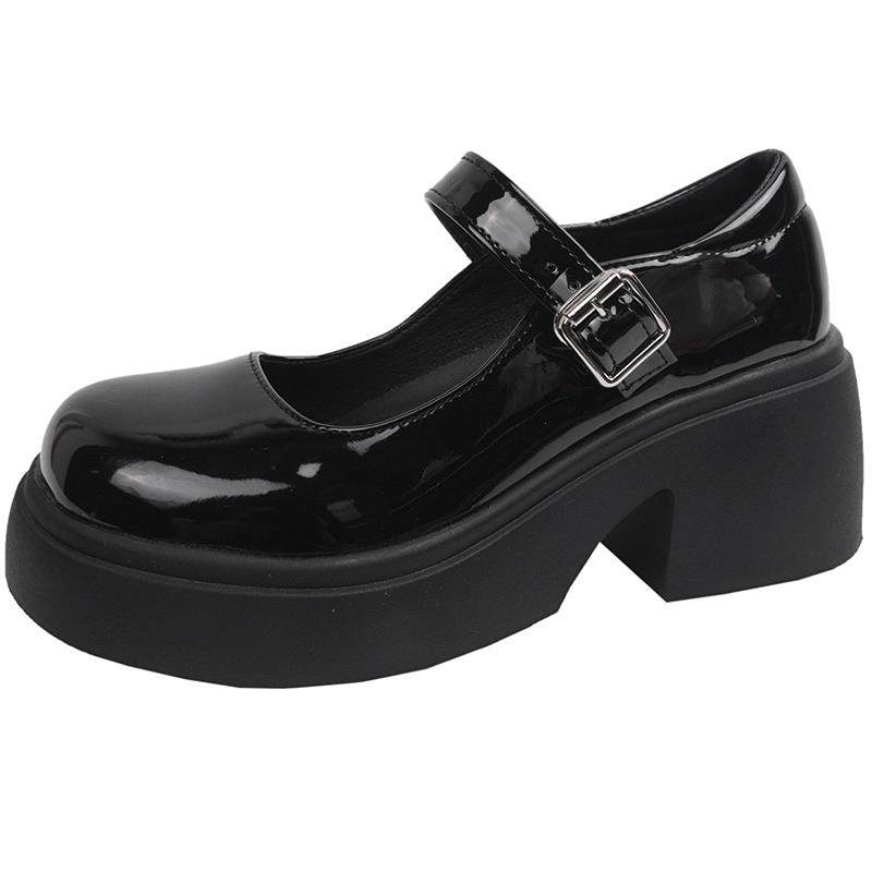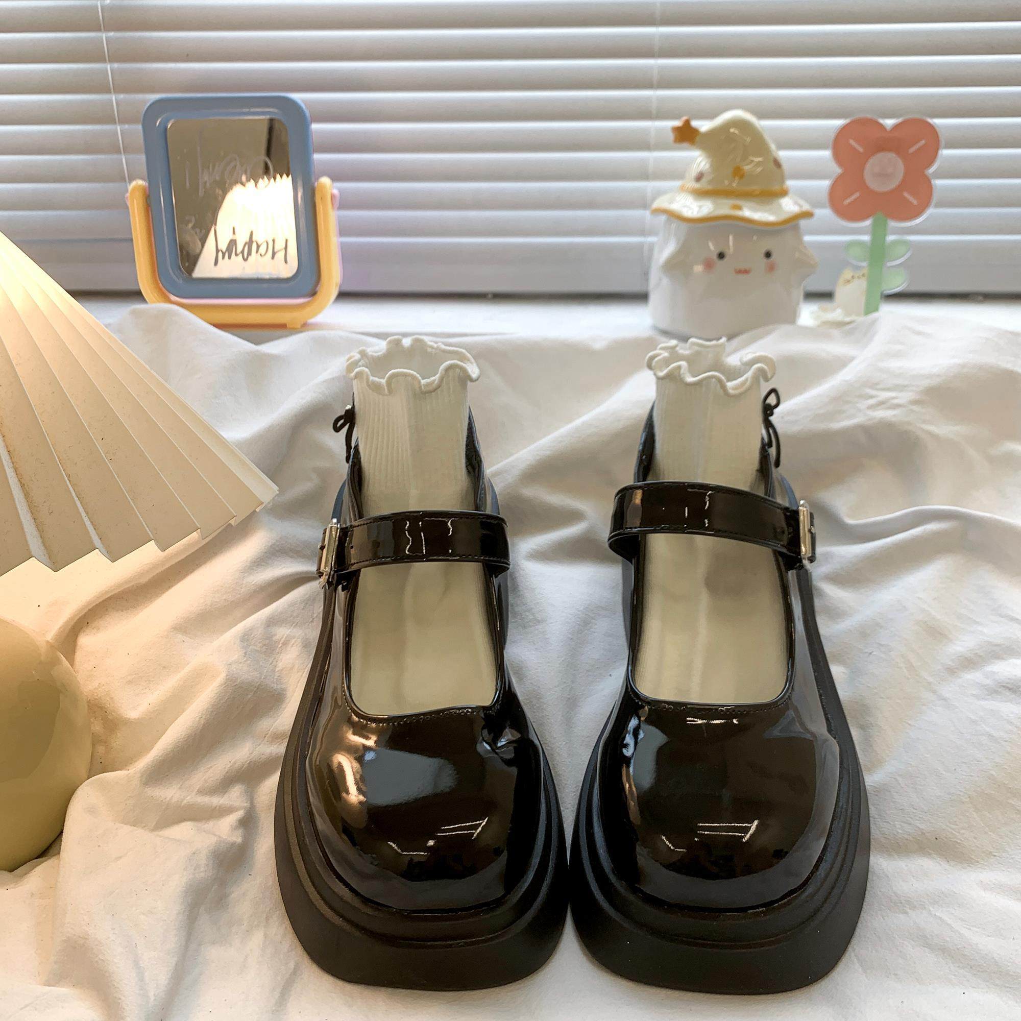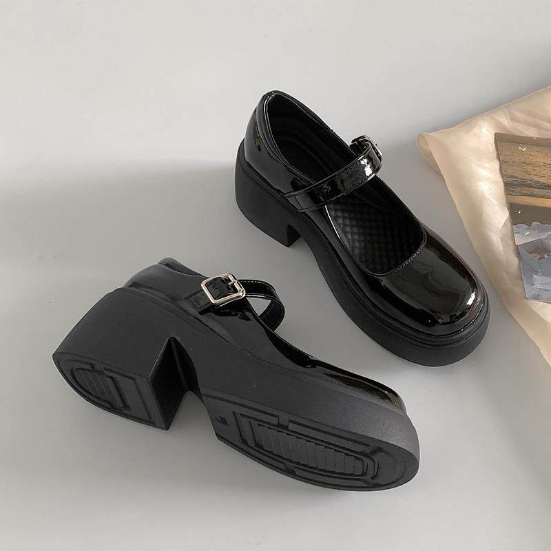 黑色百搭法式厚底高跟玛丽珍皮鞋