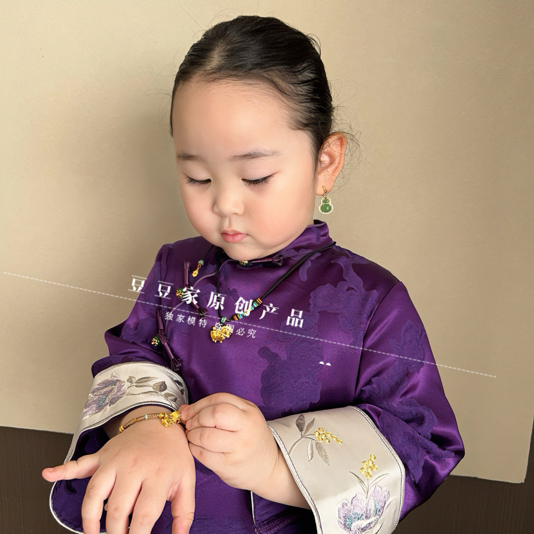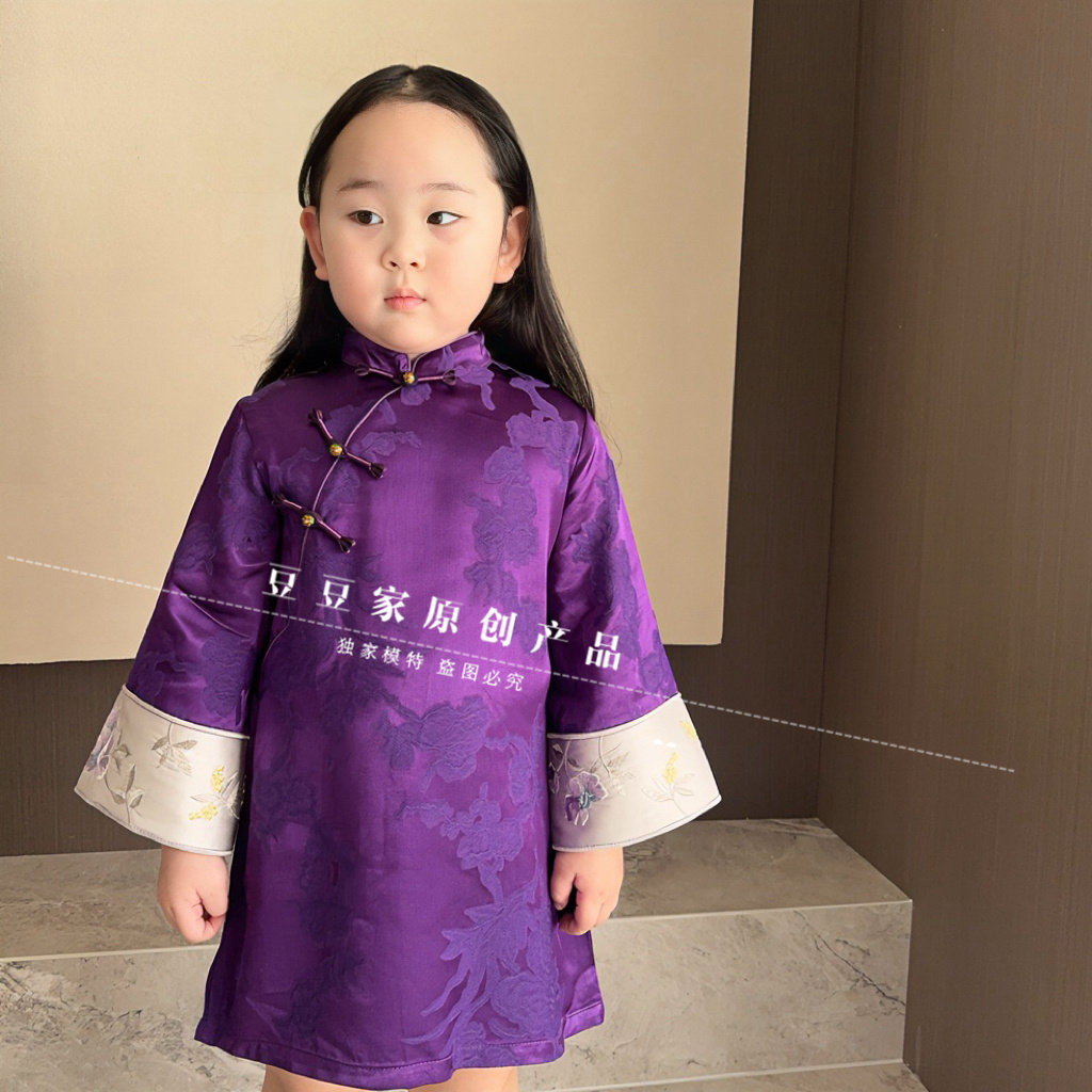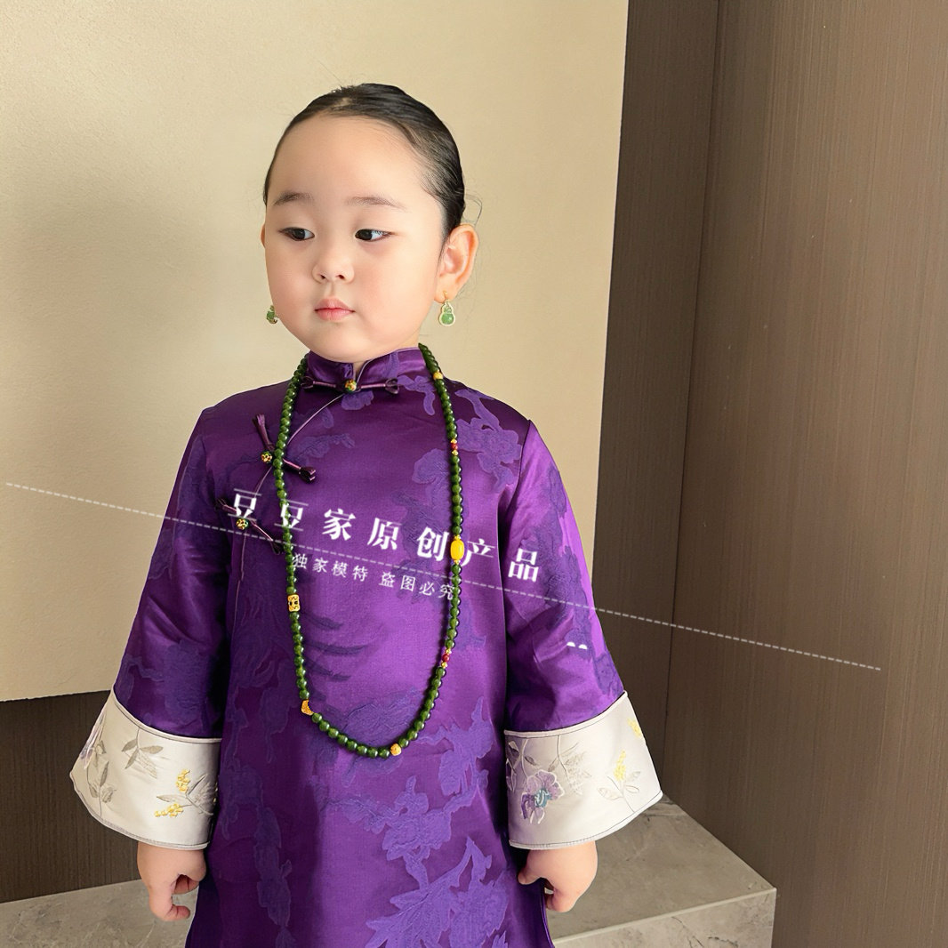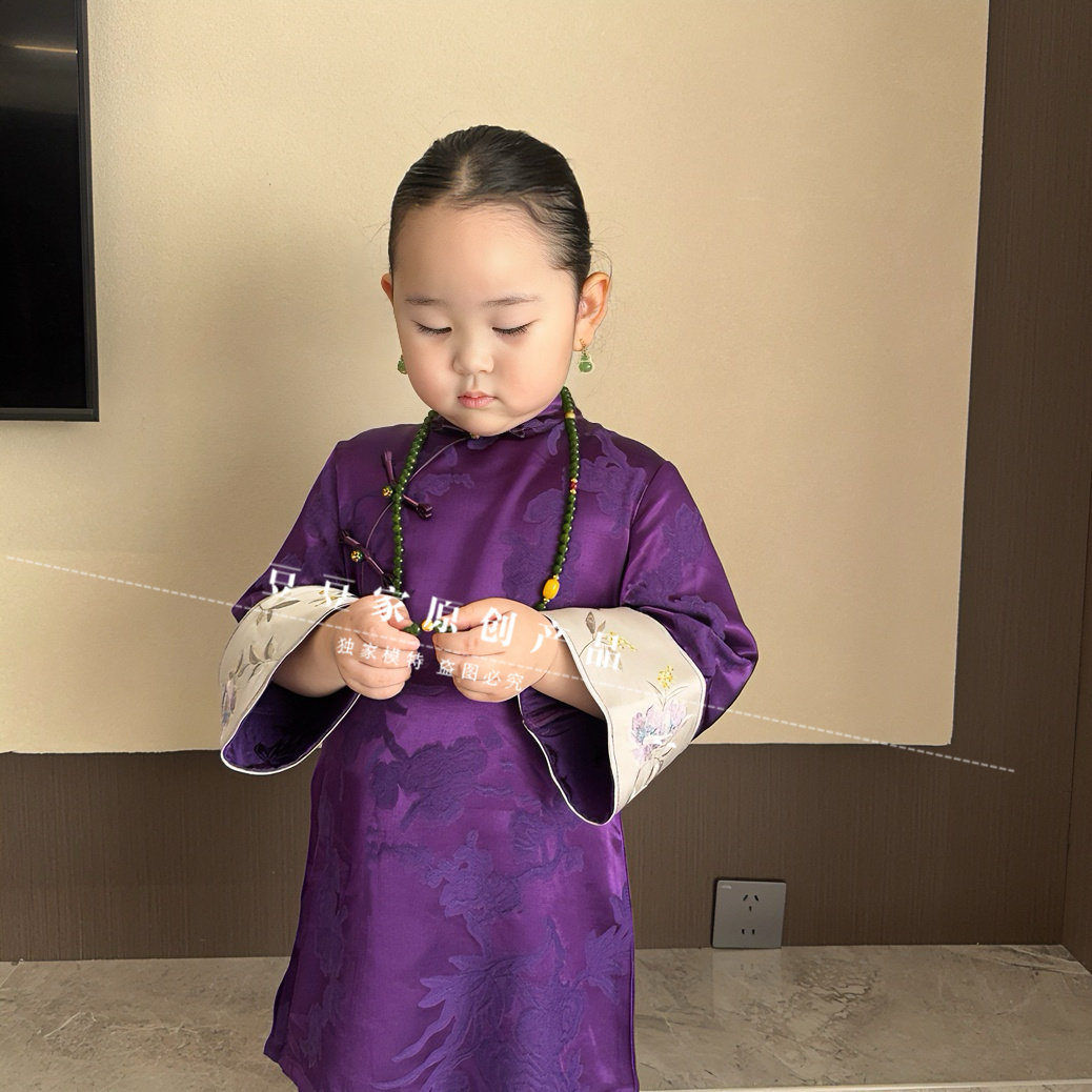 亲子款新中式儿童紫色刺绣旗袍立领长袖复古民族风儿童夹棉旗袍裙