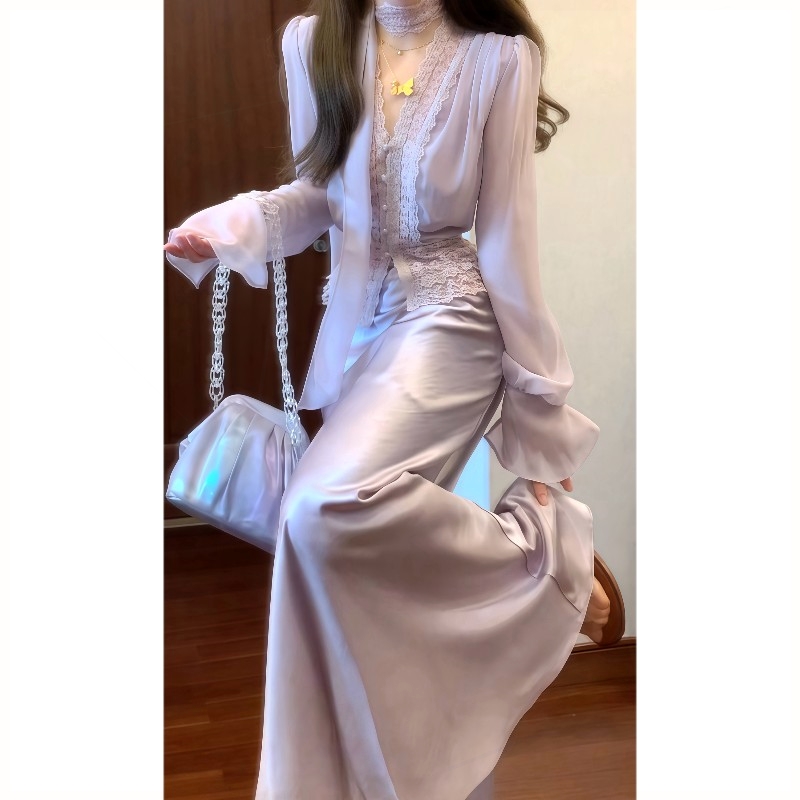 工作室原创2025秋季紫色蕾丝拼接上衣&高腰鱼尾半身长裙两件长袖