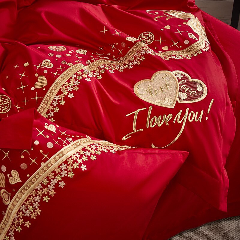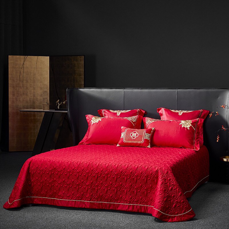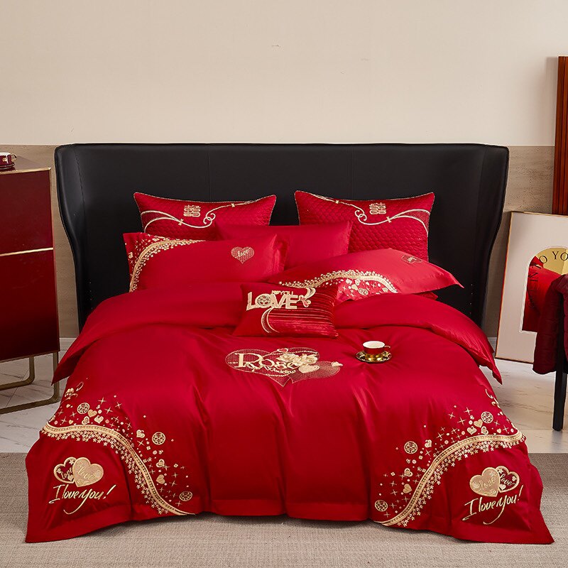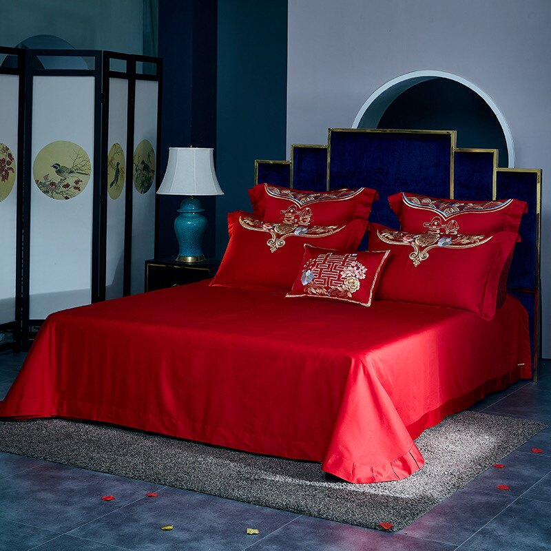 大红色喜庆结婚四l件套全棉刺绣床单被套新中式床品套件婚庆婚嫁