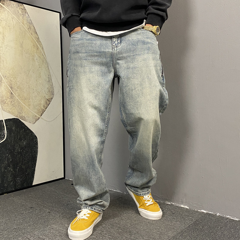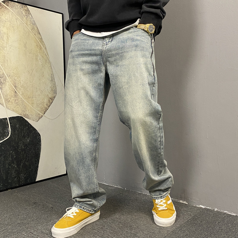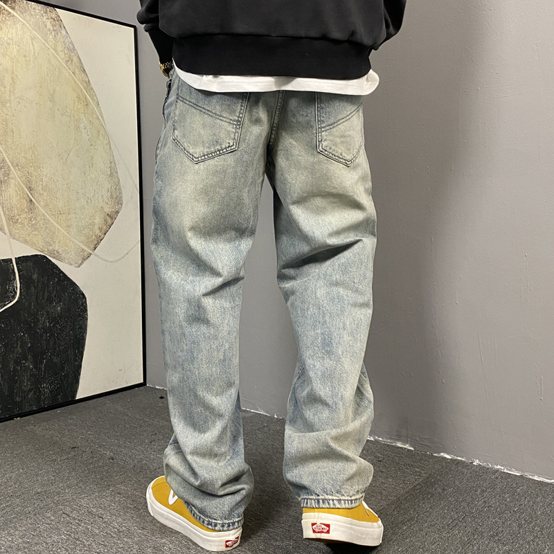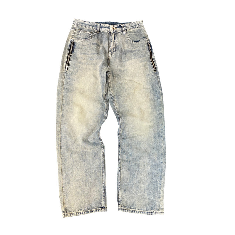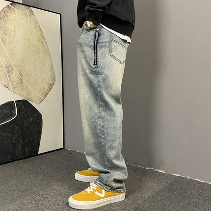 春季美式休闲痞帅水洗复古拉链牛仔裤男直筒宽松潮牌阔腿长裤子