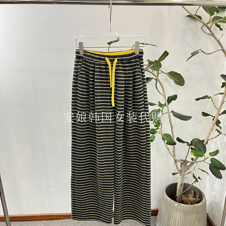 安娘韩国代购女装2025冬新百搭松紧腰抽绳条纹阔腿加厚休闲裤卫裤
