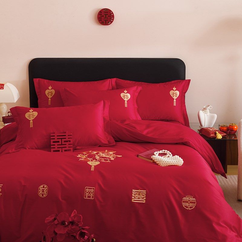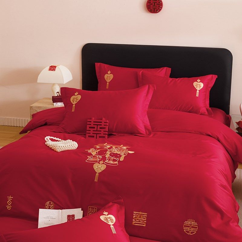 简约红色新婚四件套喜字刺绣被套结婚床单K女方陪嫁娶婚房床上用