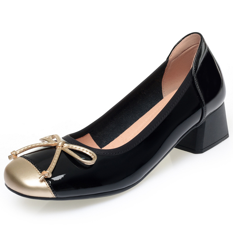 官方特卖正品软皮单鞋女2025春秋新款粗跟中跟小香风蝴蝶结小皮鞋