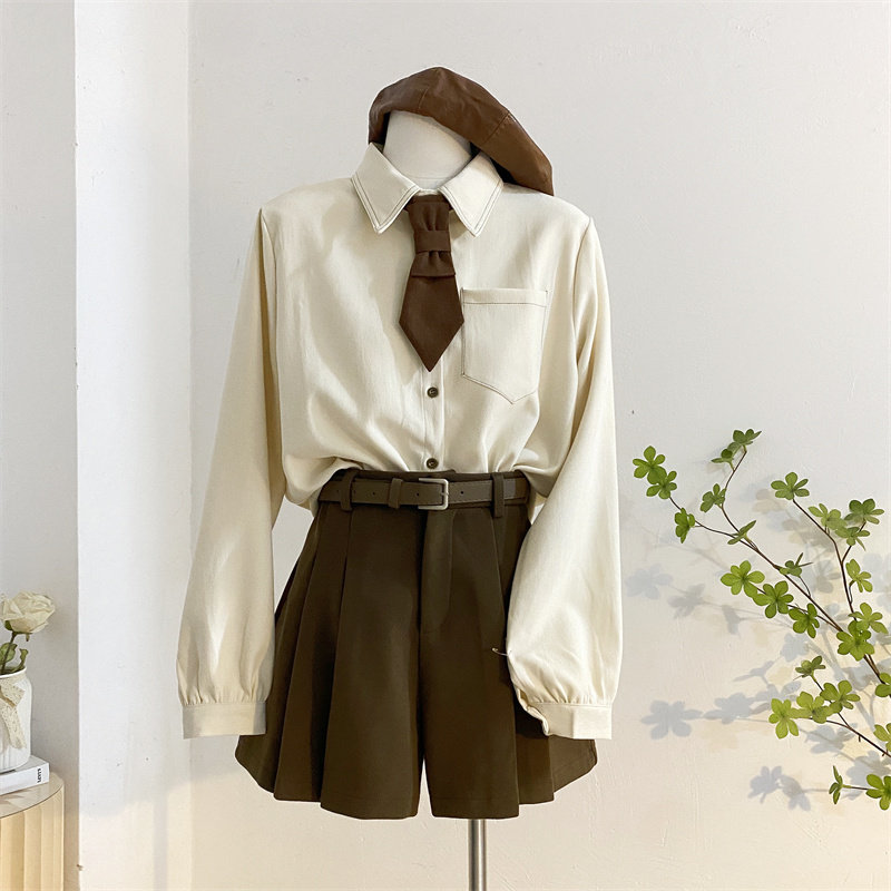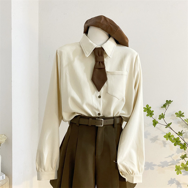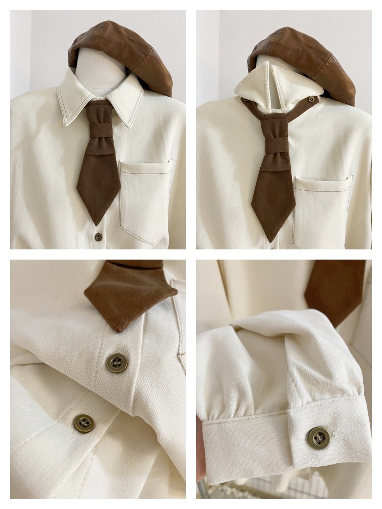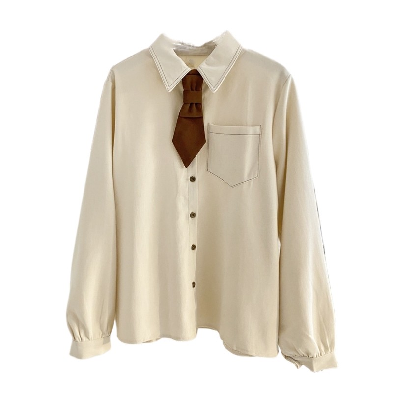 宽松韩版单排扣长袖磨毛领带衬衫