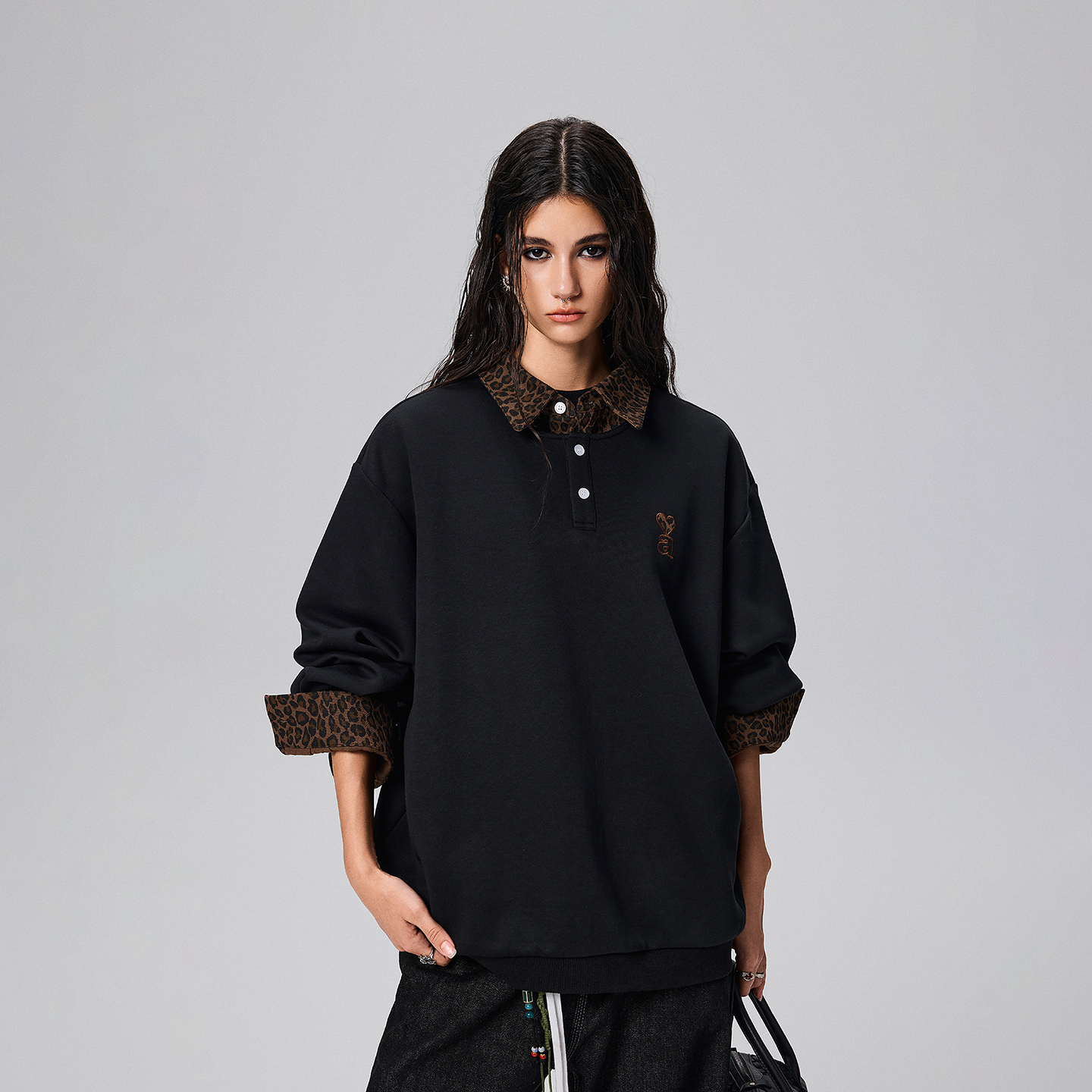 【Achock官方店】复古街头豹纹拼接翻领卫衣美式重磅polo套头外套