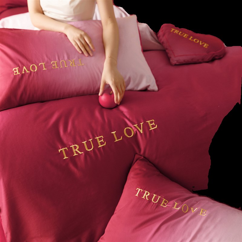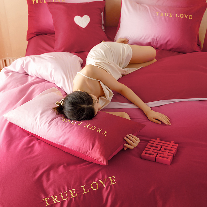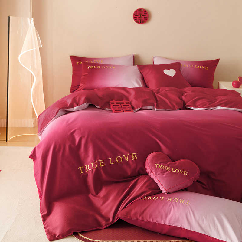 微醺渐层红色100支长绒棉婚庆四件组被套婚嫁结婚牀上用品1.8