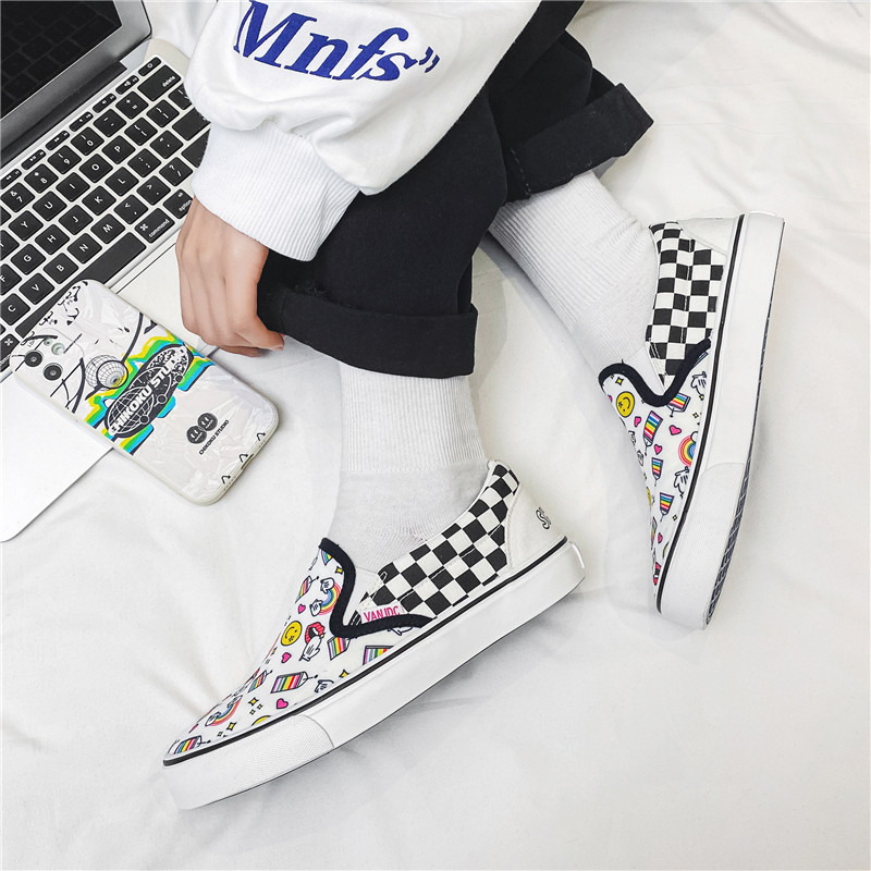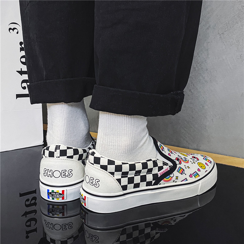 夏季新款透气懒人一脚蹬帆布鞋女格子卡通马里奥图案方格板鞋788