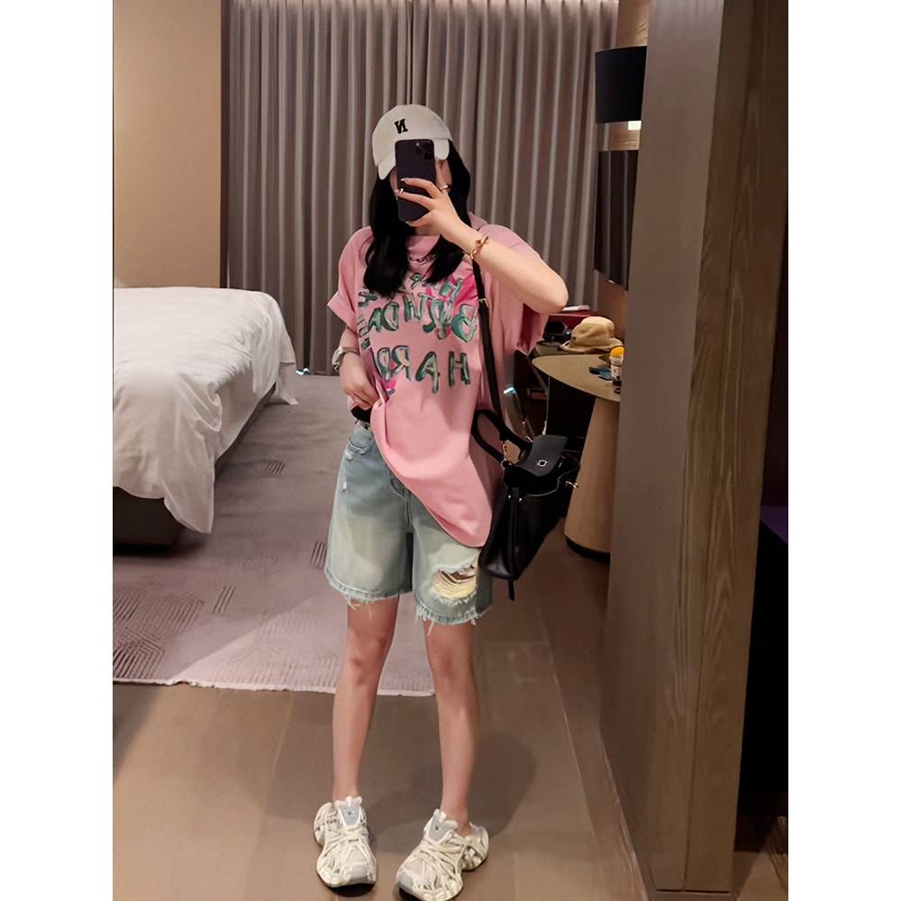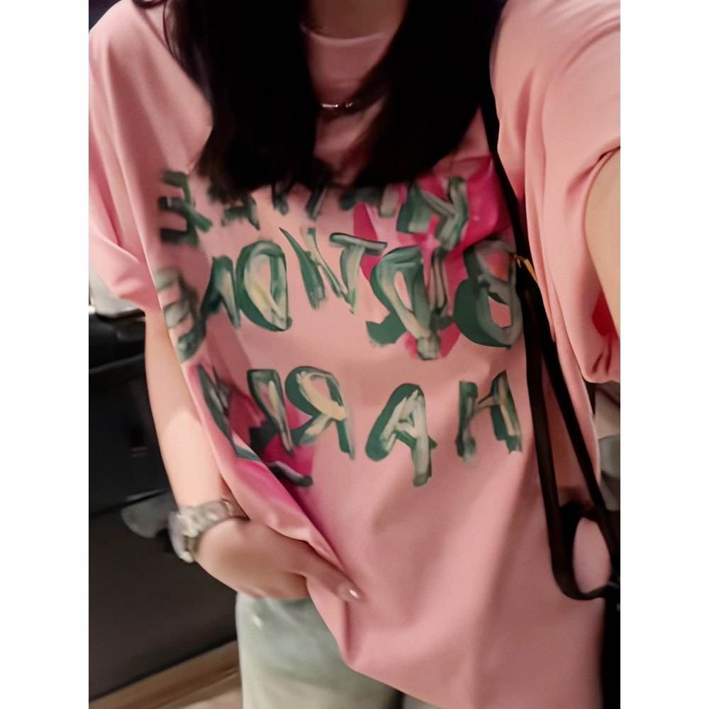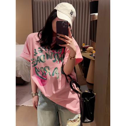 2025新款夏季宽松韩版字母印花短袖T恤女圆领高级感粉色百搭上衣