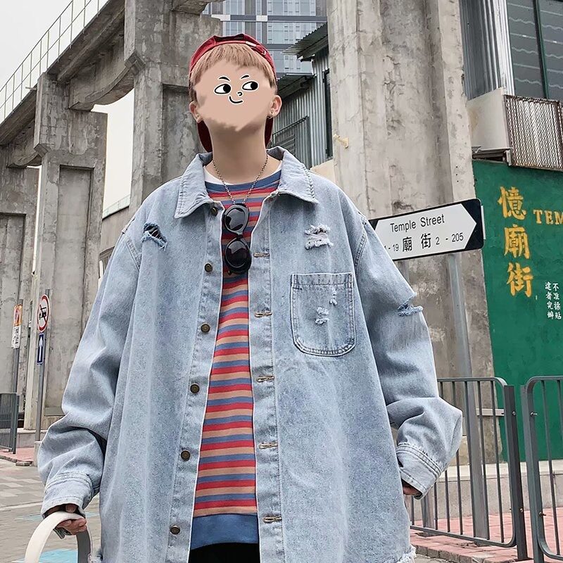 美式春秋款ins复古破洞牛仔外套男韩版潮流学生宽松百搭帅气夹克