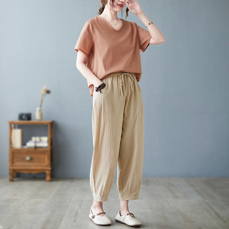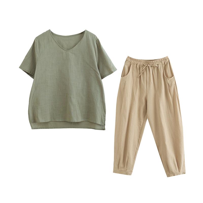 棉麻套装女2024夏季新款宽松大码纯色短袖上衣显瘦哈伦裤两件套潮