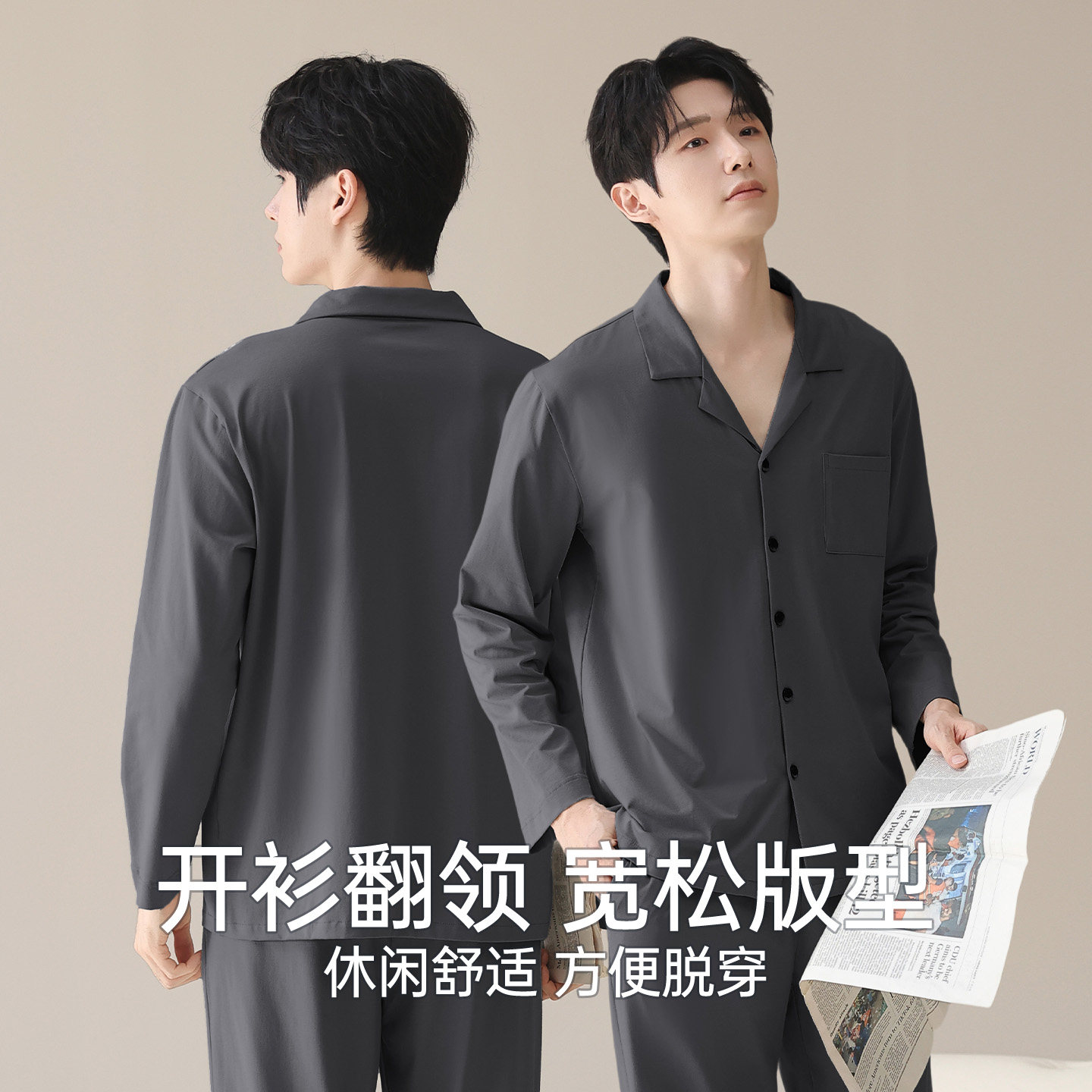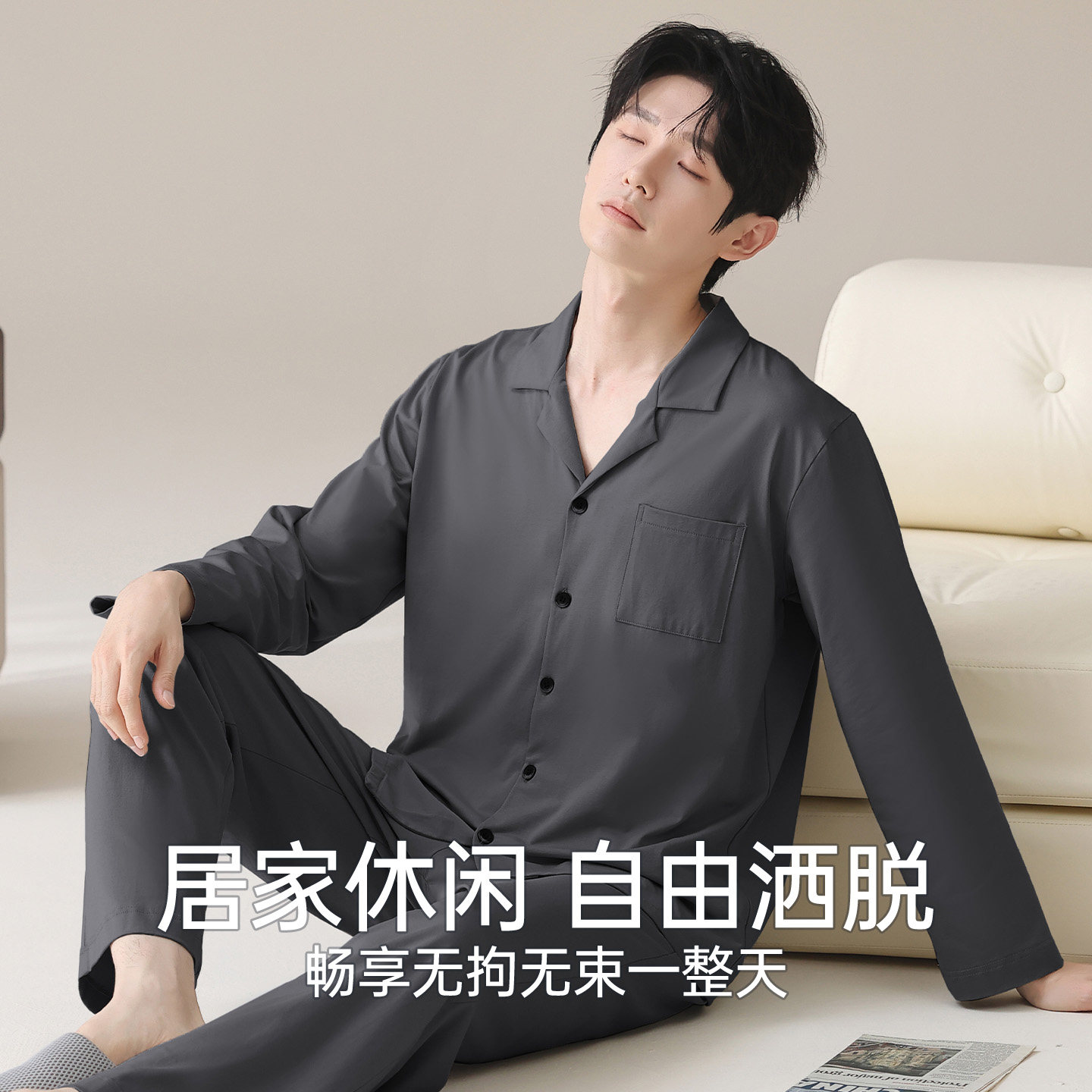 恒源祥男士100%纯棉薄睡衣套装春夏季长袖青少年男抗菌防螨家居服