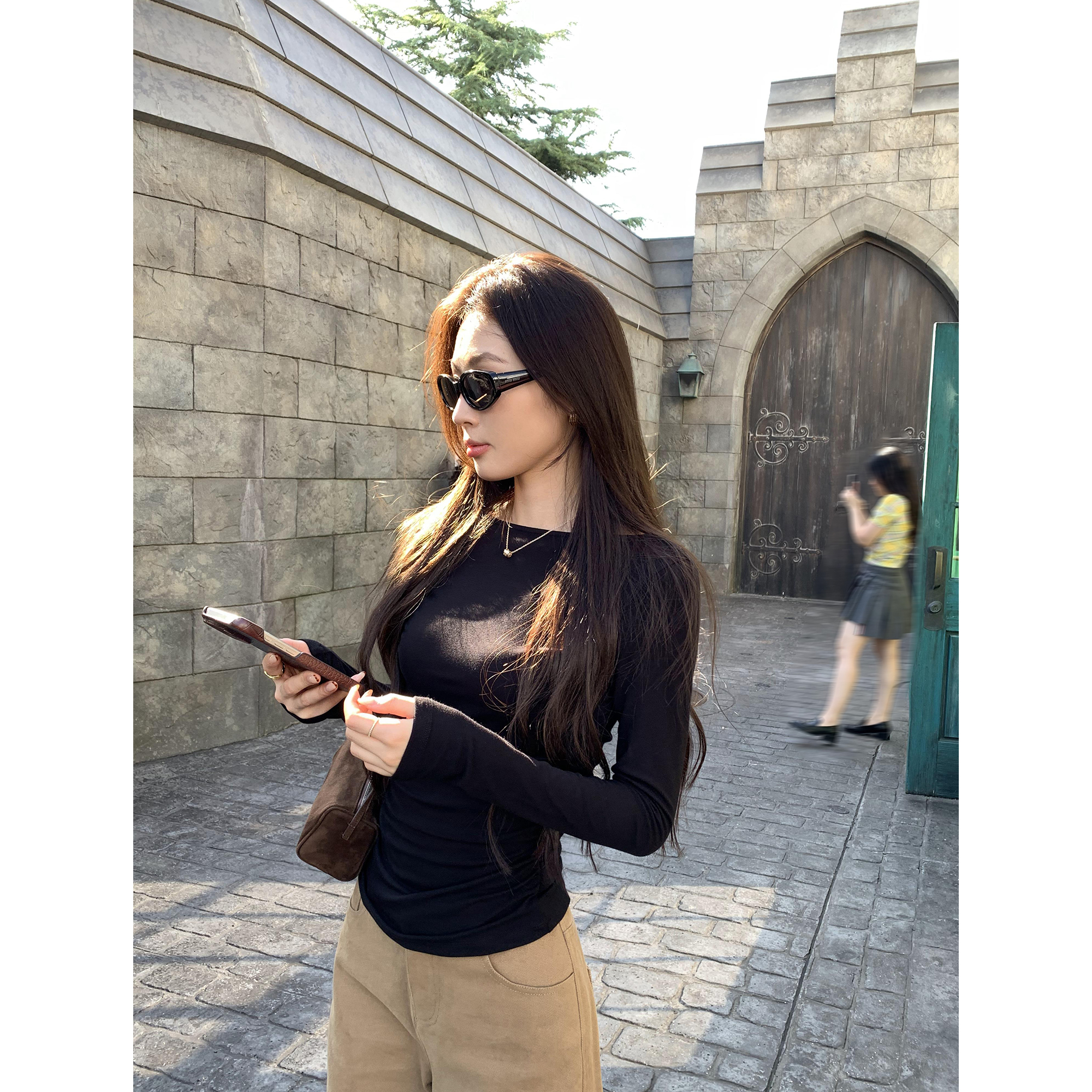 pusumede 百搭公式 气质小船领长袖针织衫女修身显瘦打底衫上衣
