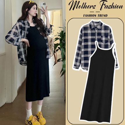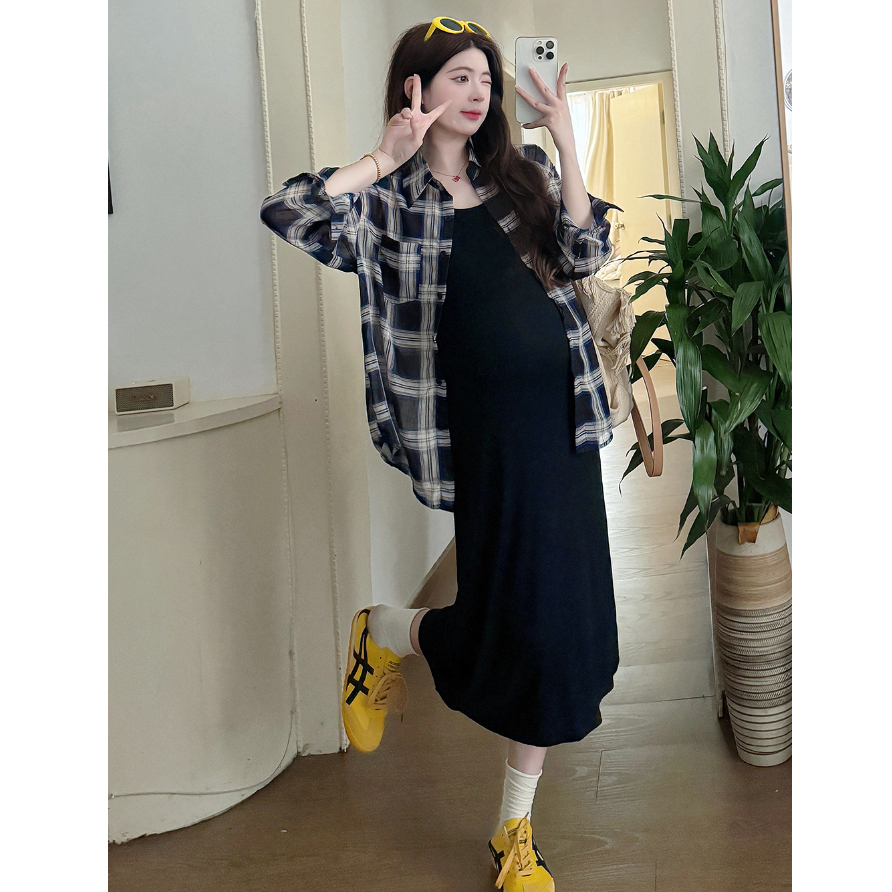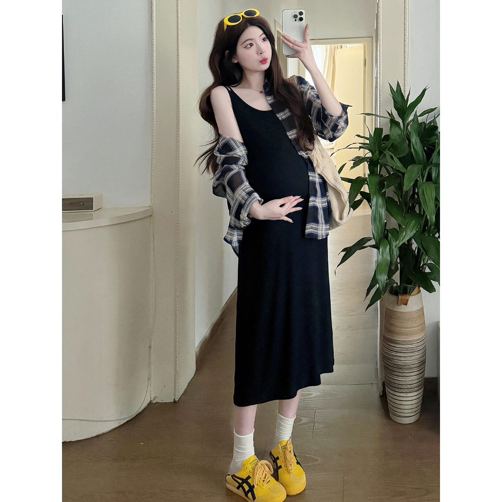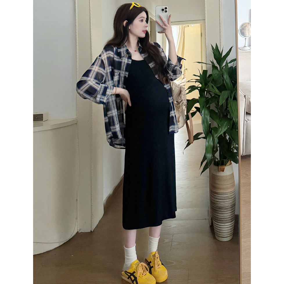 孕妇连衣裙套装夏季2025新款宽松慵懒风衬衫黑色显瘦吊带裙两件套
