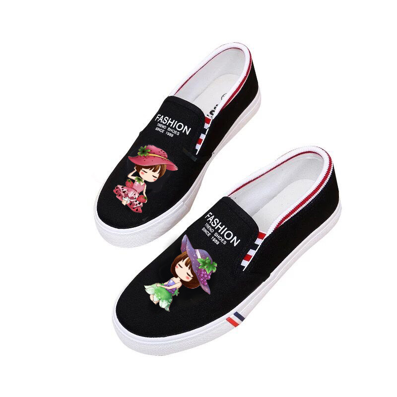 春夏新款平底一脚蹬懒人鞋卡通涂鸦韩版女学生帆布鞋百搭透气女鞋
