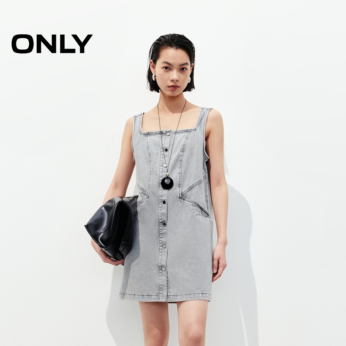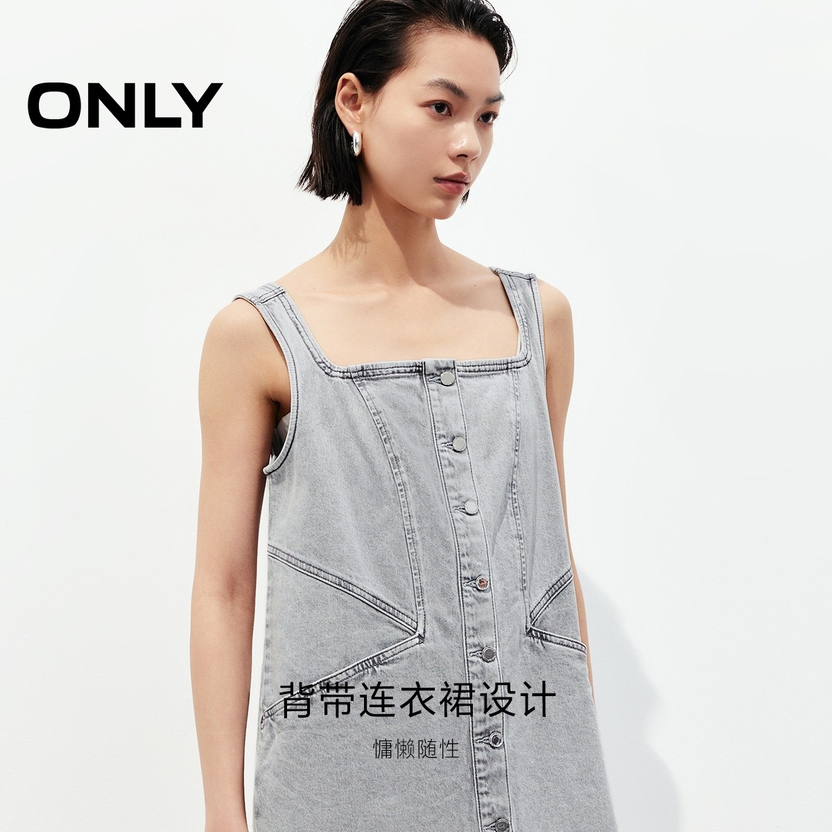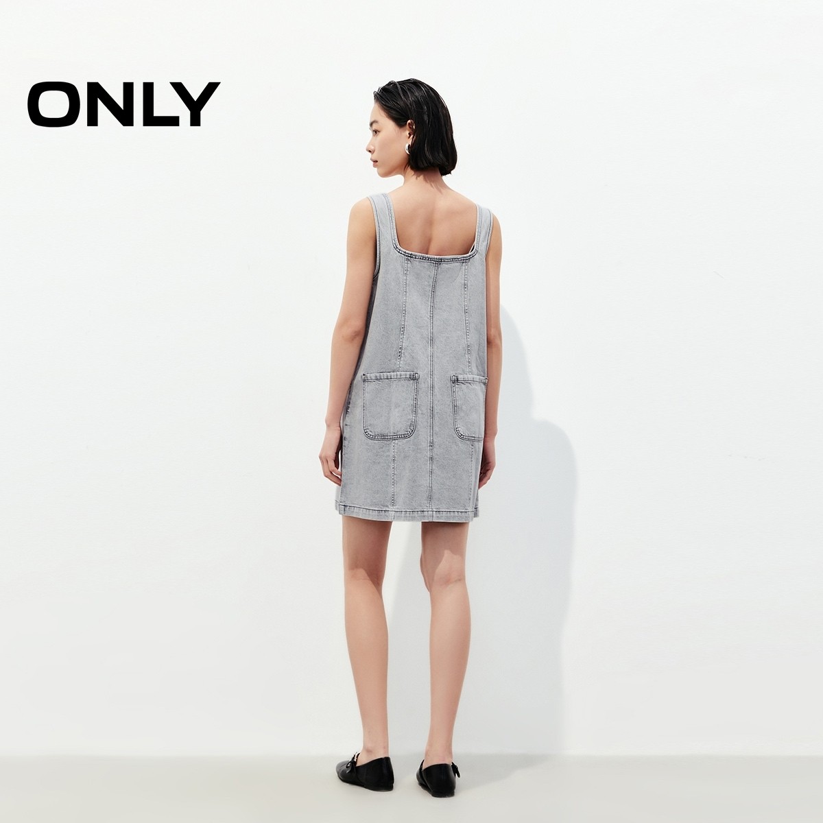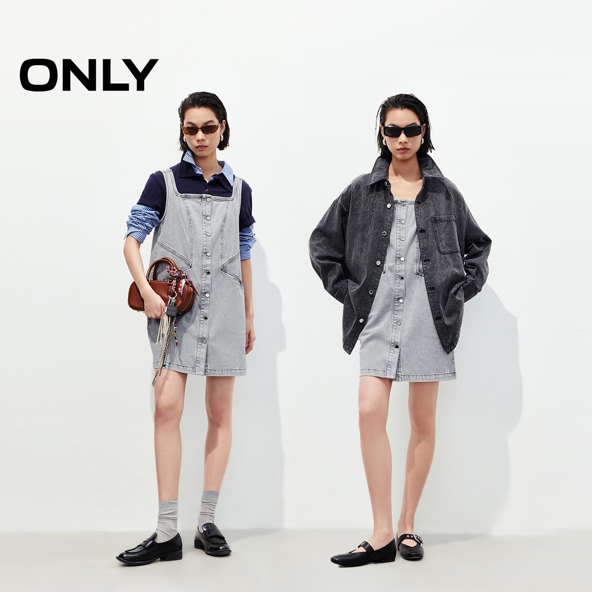 ONLY2025秋冬新款复古水洗工艺隐藏贴袋直筒短裙牛仔背带连衣裙女
