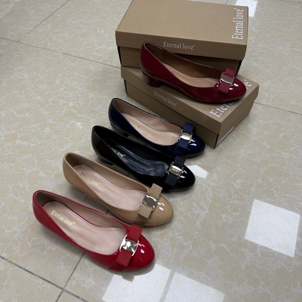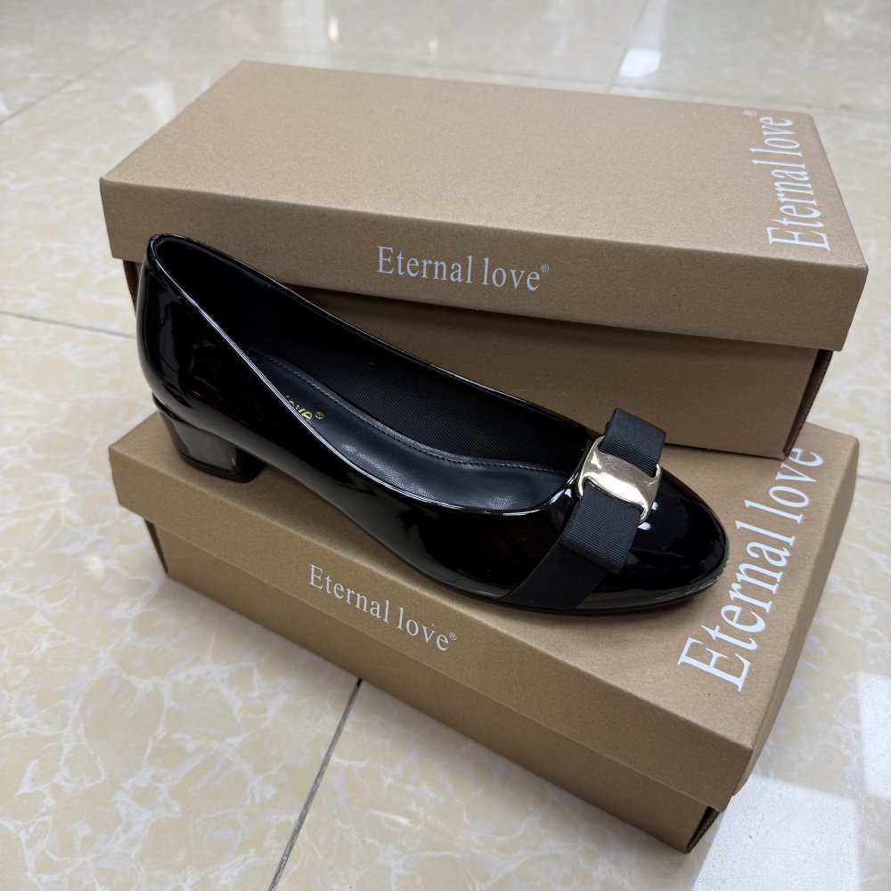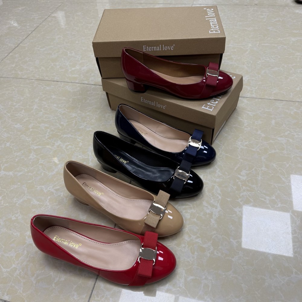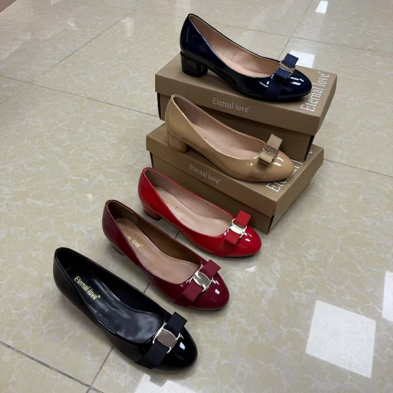 欧美外贸时尚百搭漆皮金属扣蝴蝶结粗跟中跟圆头女单鞋