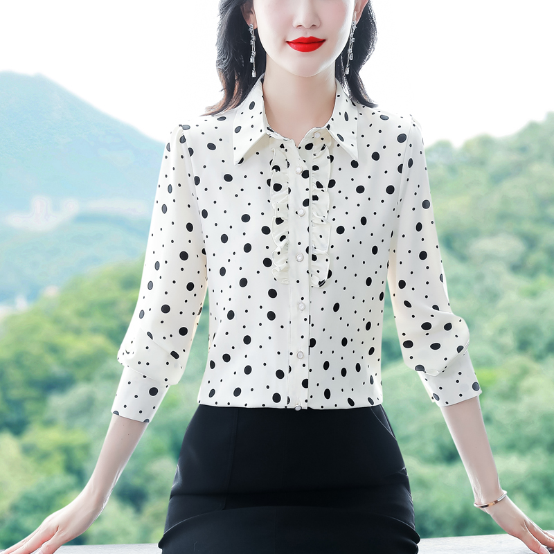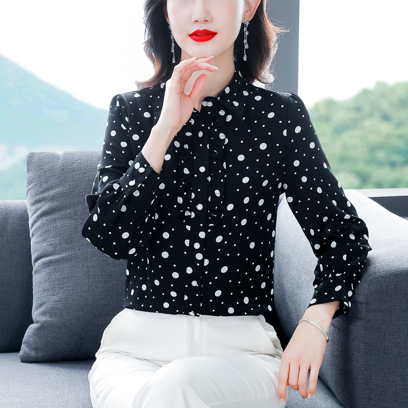 女士高档衬衫秋季新款长袖洋气波点印花桑蚕丝真丝上衣遮肚子小衫