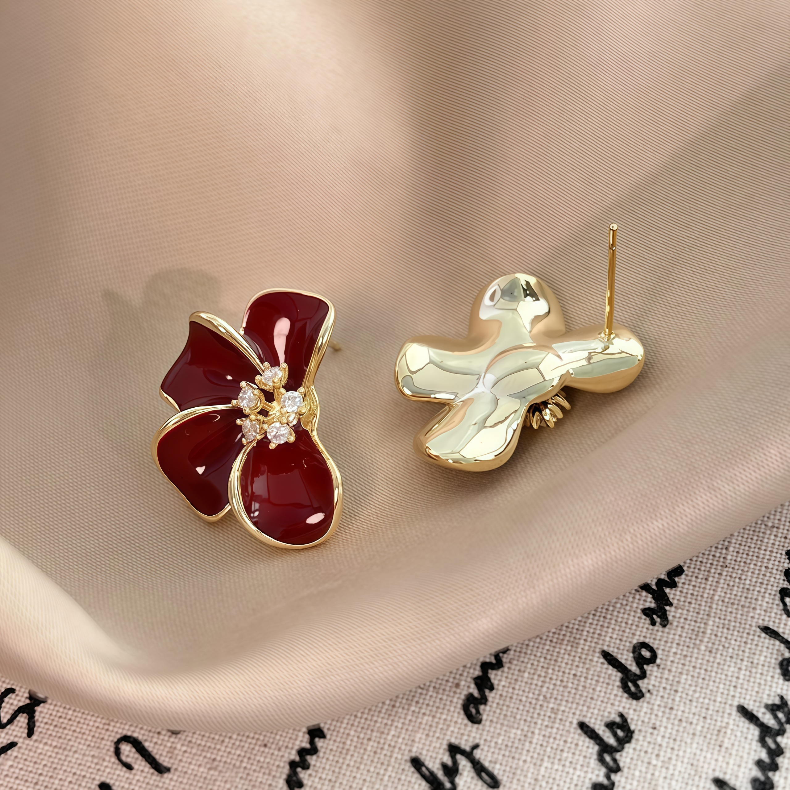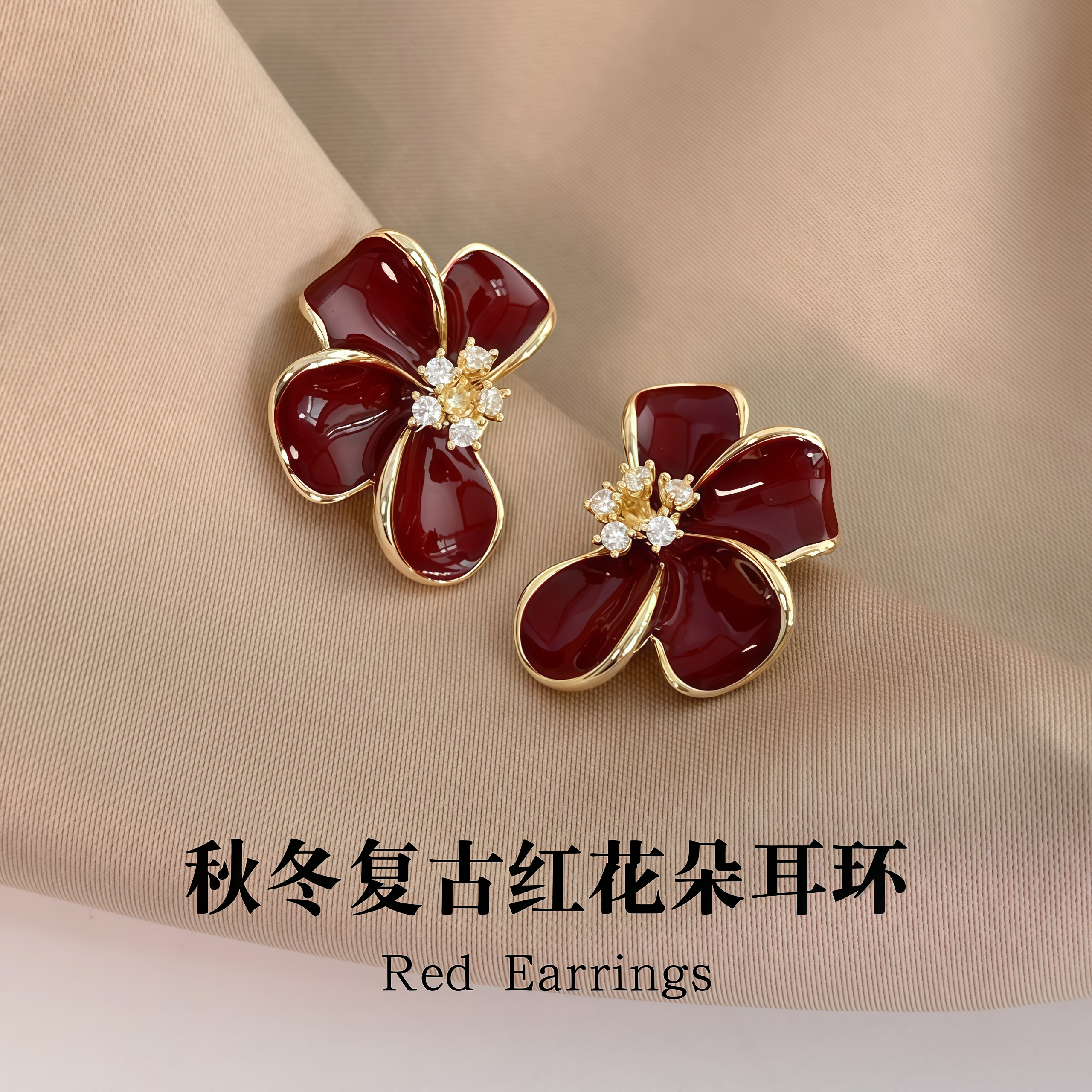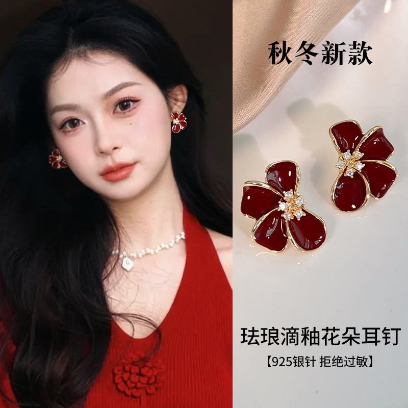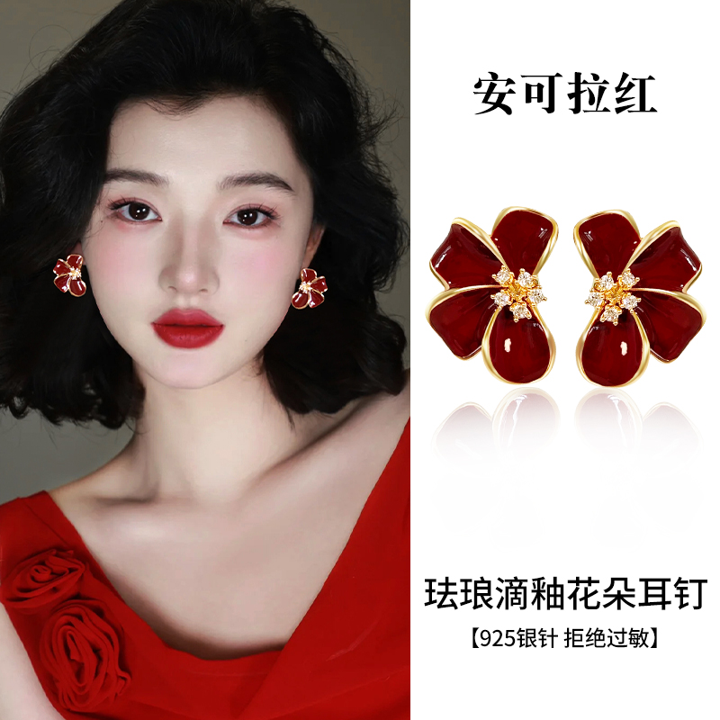 伊灿复古秋冬红色滴釉耳钉女纯银