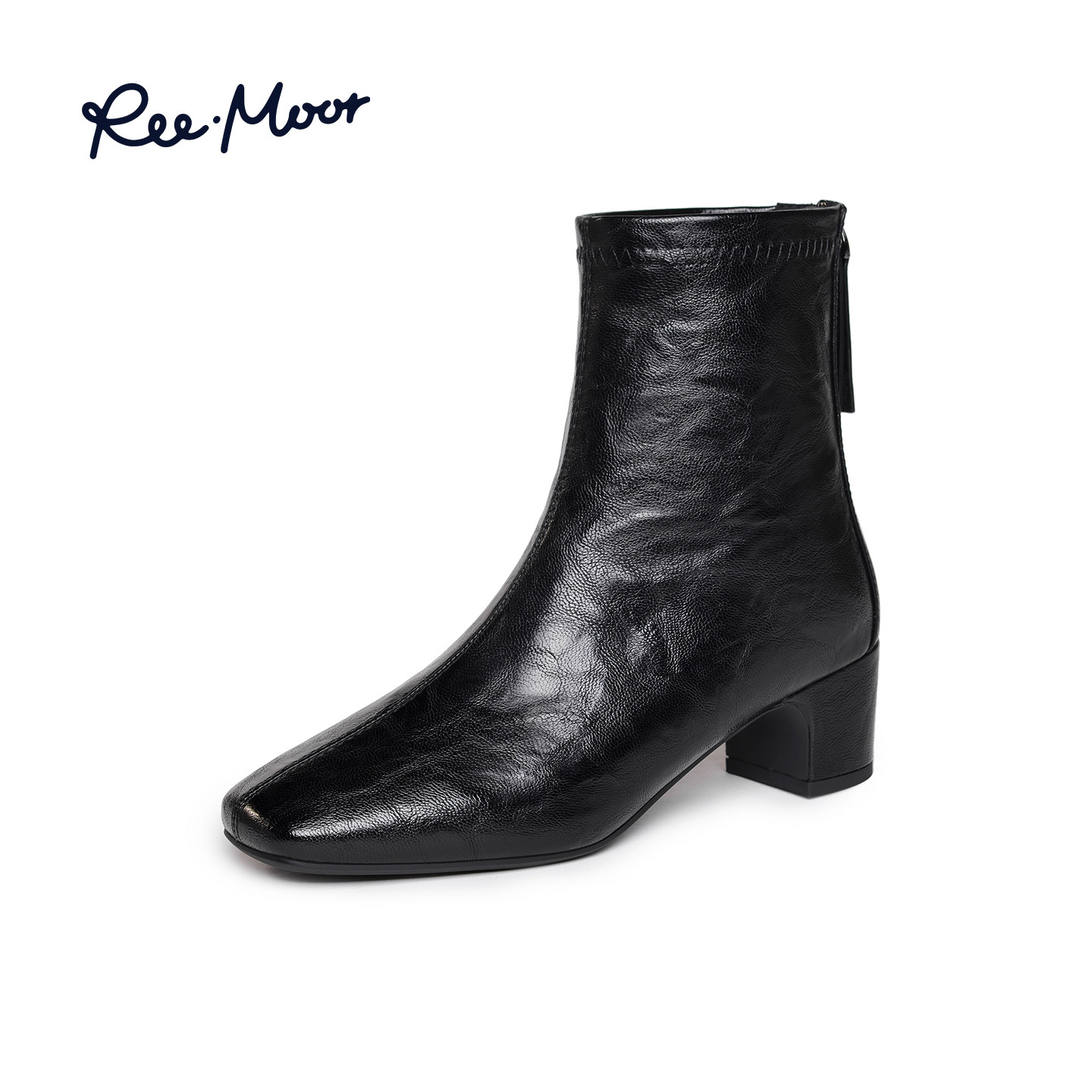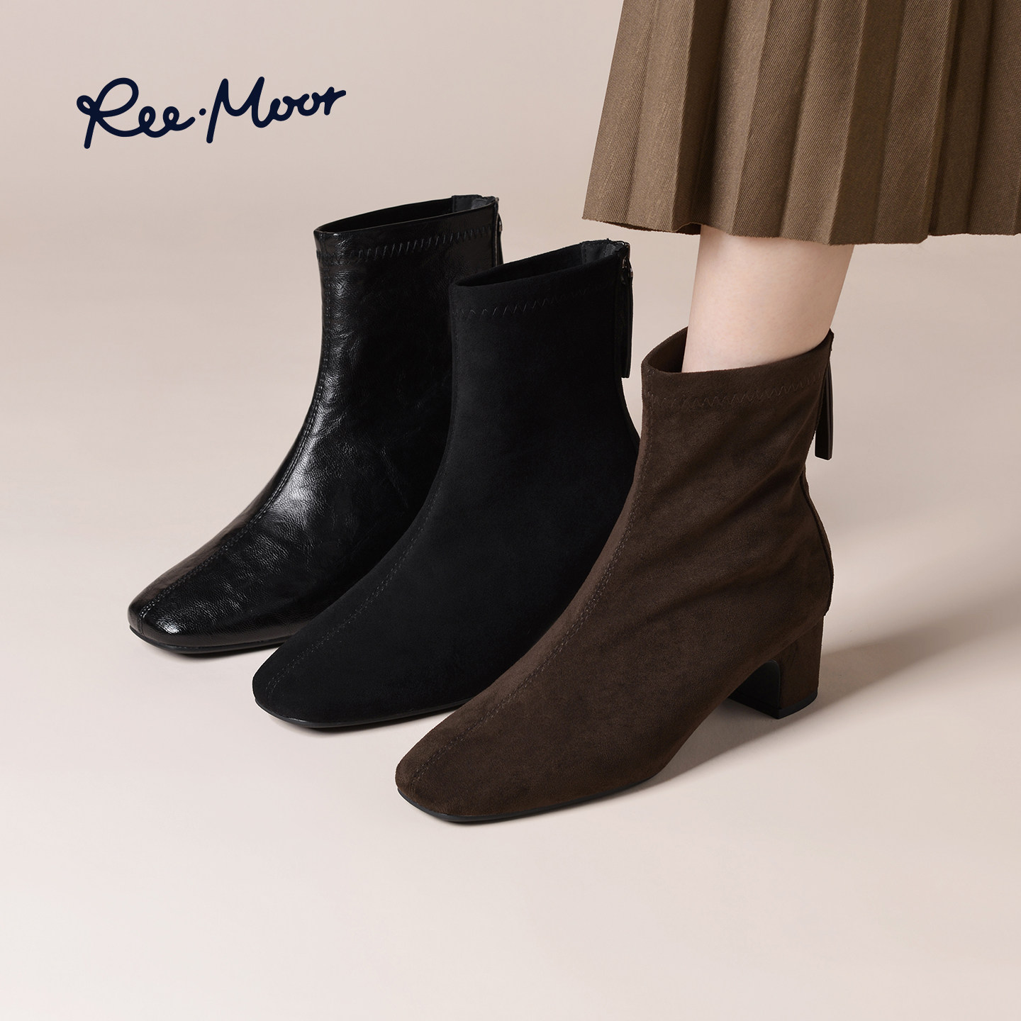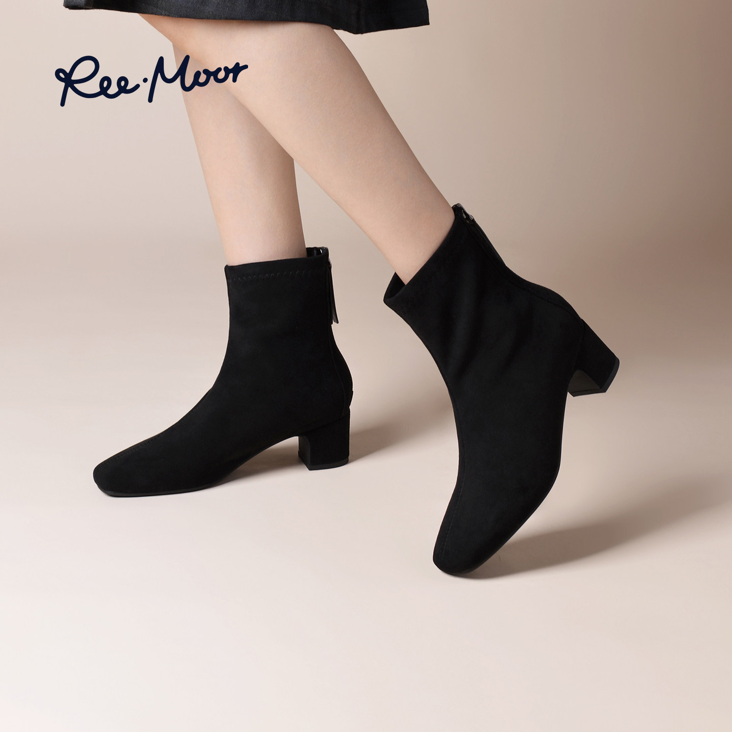 reemoor睿慕2025秋冬新款粗跟时装靴女法式复古绒面方头中跟短靴