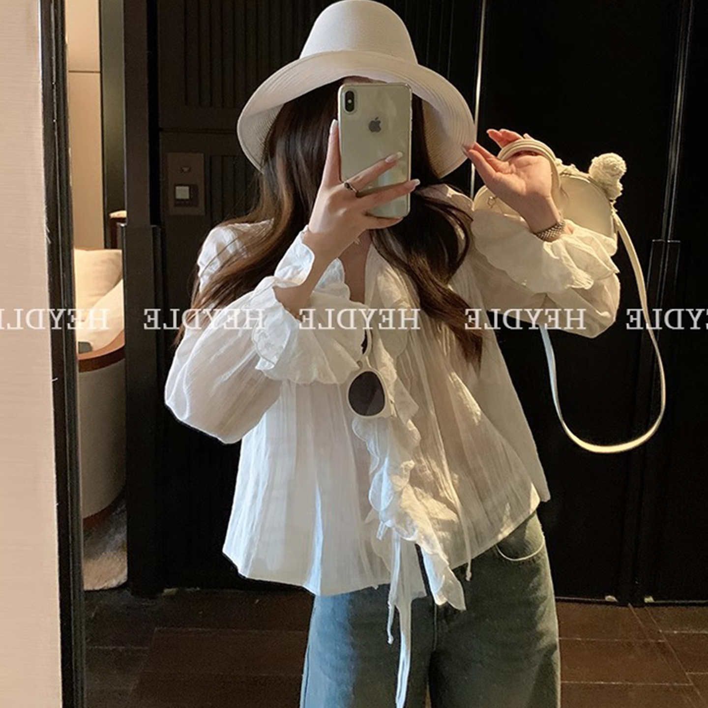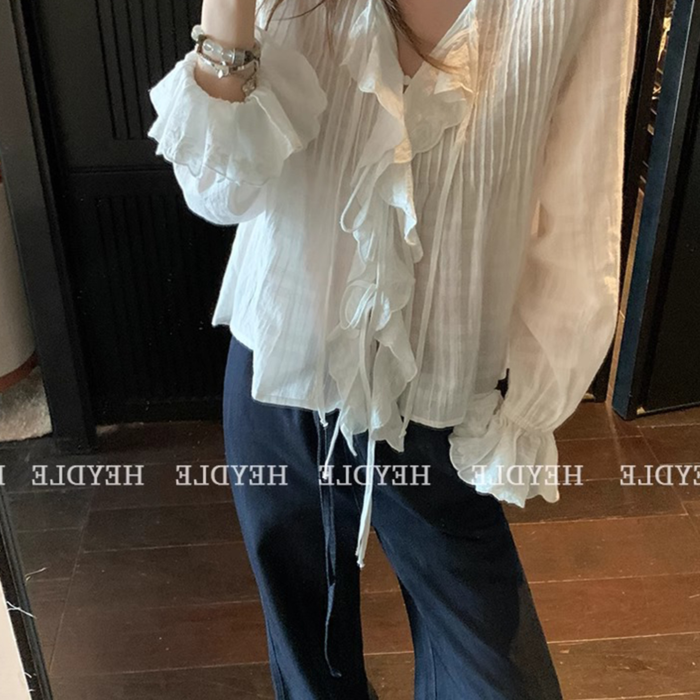 白色荷叶边雪纺衬衫女薄款夏季新款小众休闲长袖防晒衬衣外套上衣