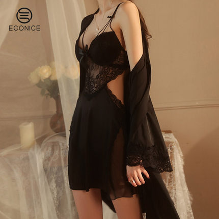 纯欲风睡衣女夏超火辣黑丝性感吊带睡裙冰丝蕾丝带胸垫家居服套装