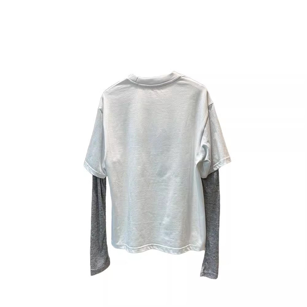 欧货2025新款撞色袖拼接卡通休闲圆领打底衫假两件长袖T恤上衣女