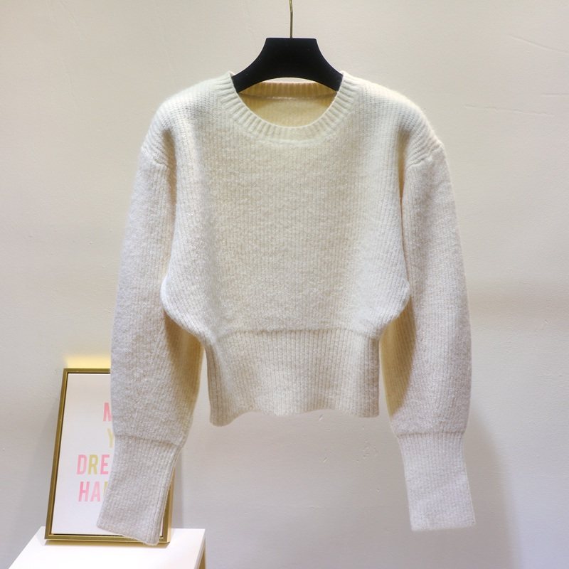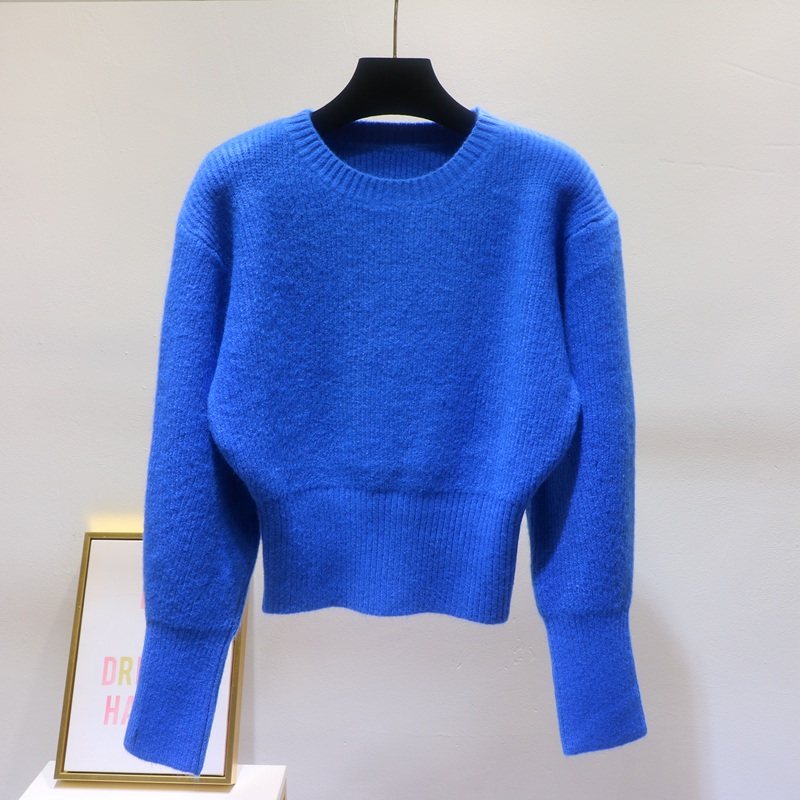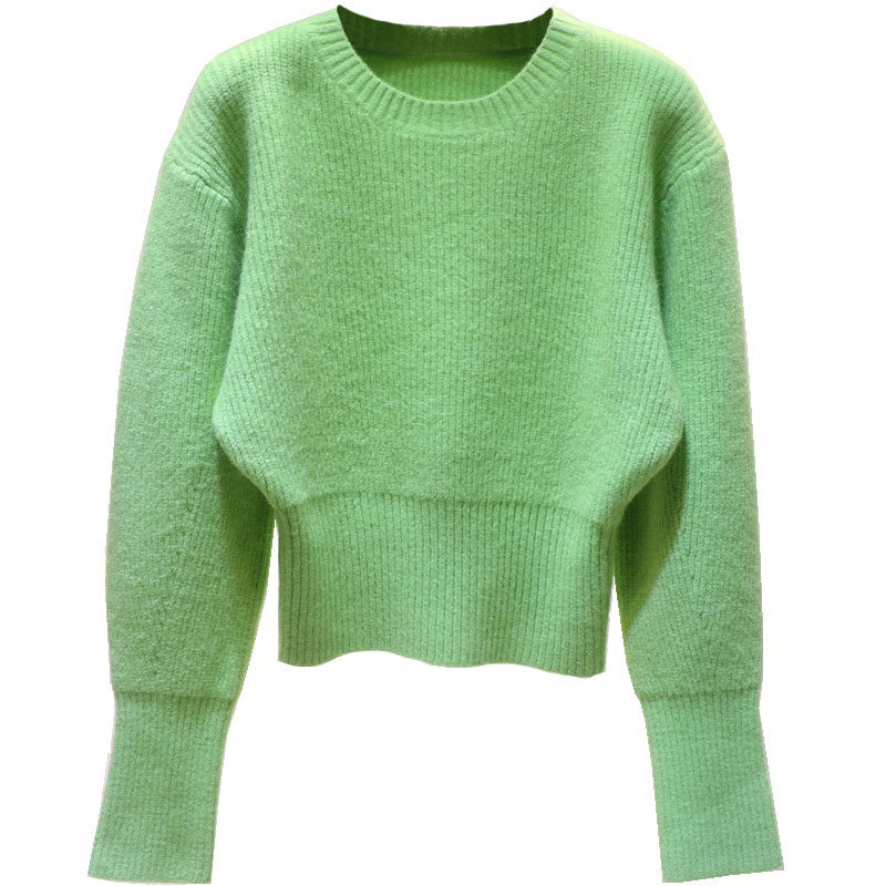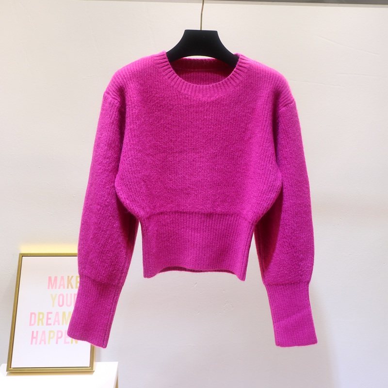 秋冬女高腰短款软糯羊绒衫套头圆领蝙蝠衫毛衣宽松加厚打底衫长袖