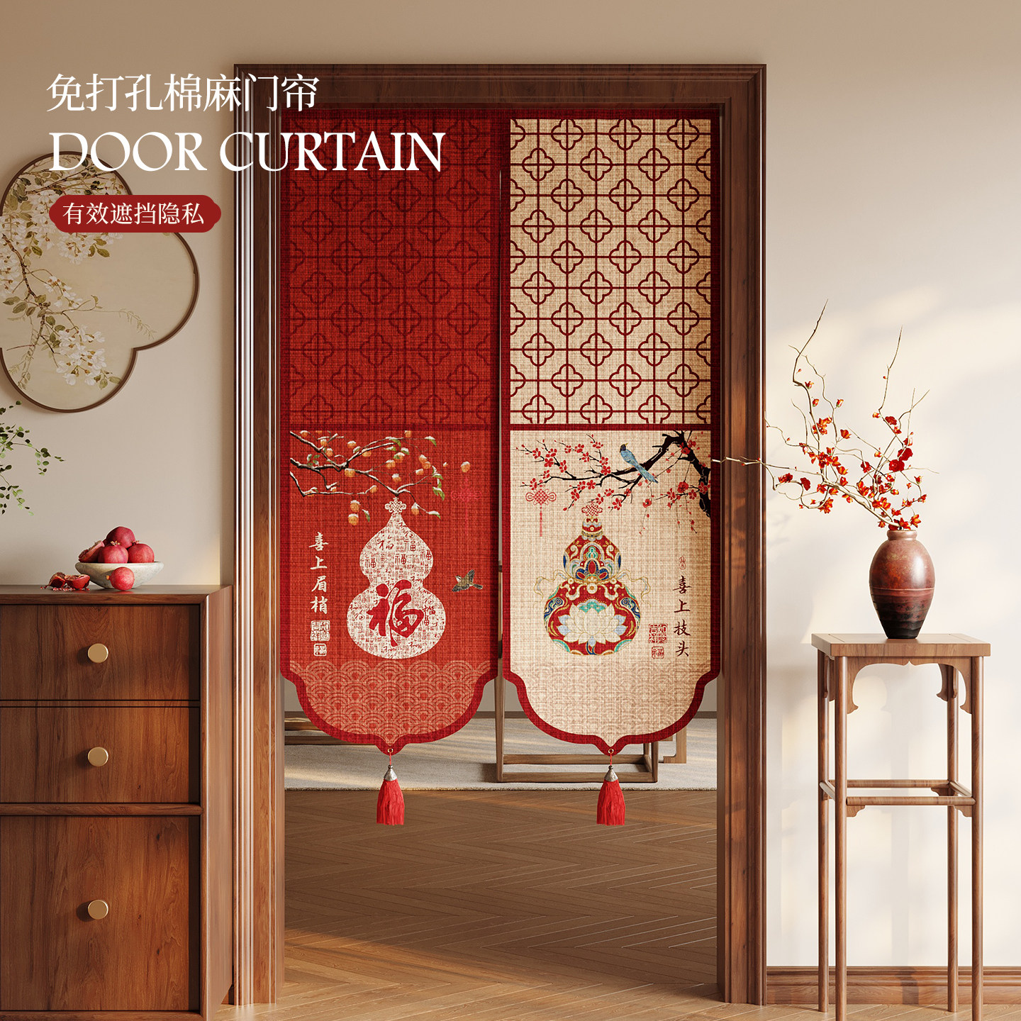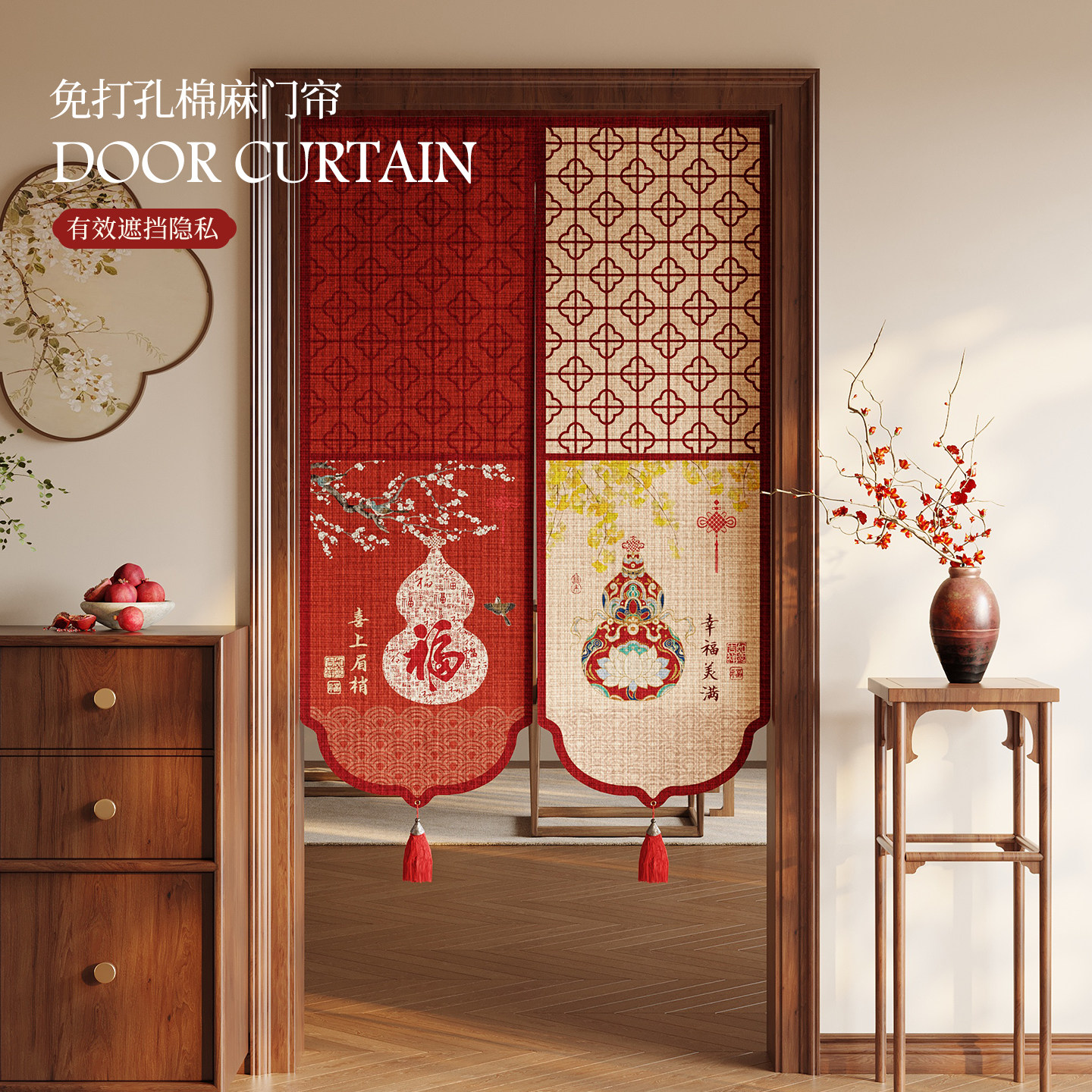 新中式新年红色卧室门帘免打孔卫生间遮挡布帘厨房隔断帘2026新款