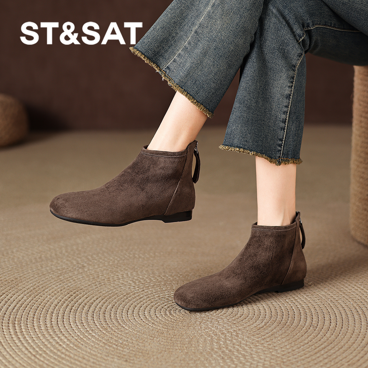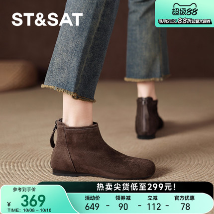 星期六羊皮短靴女秋冬平底瘦瘦靴
