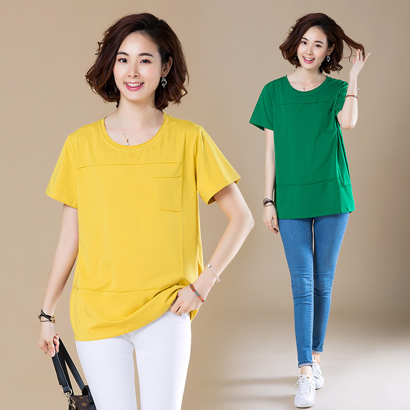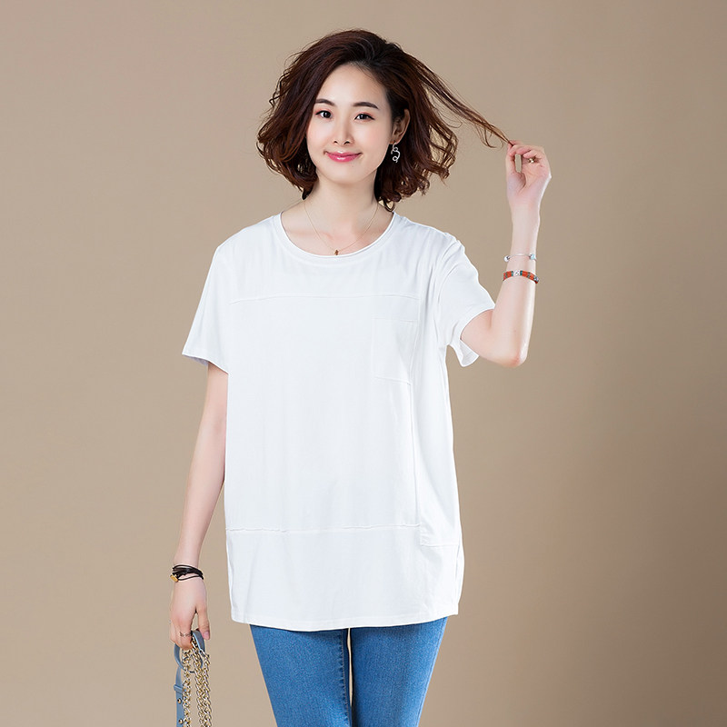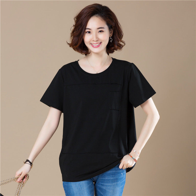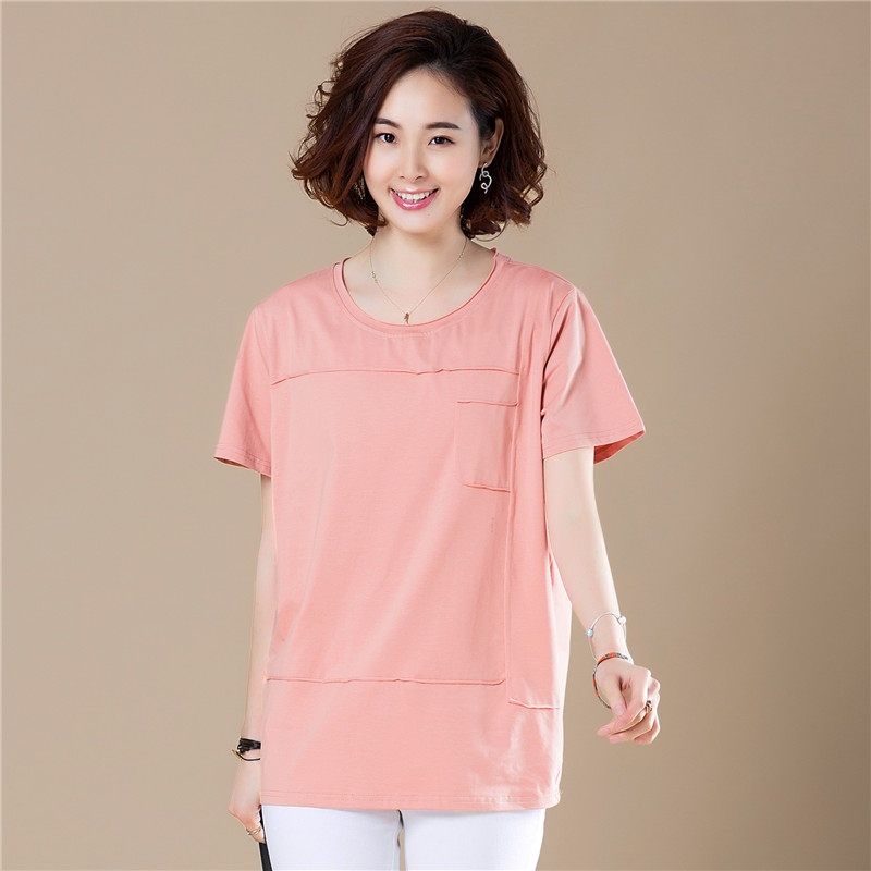 夏季加肥加大码宽松T恤女短袖全棉中长款显瘦纯色中年妈妈体恤女