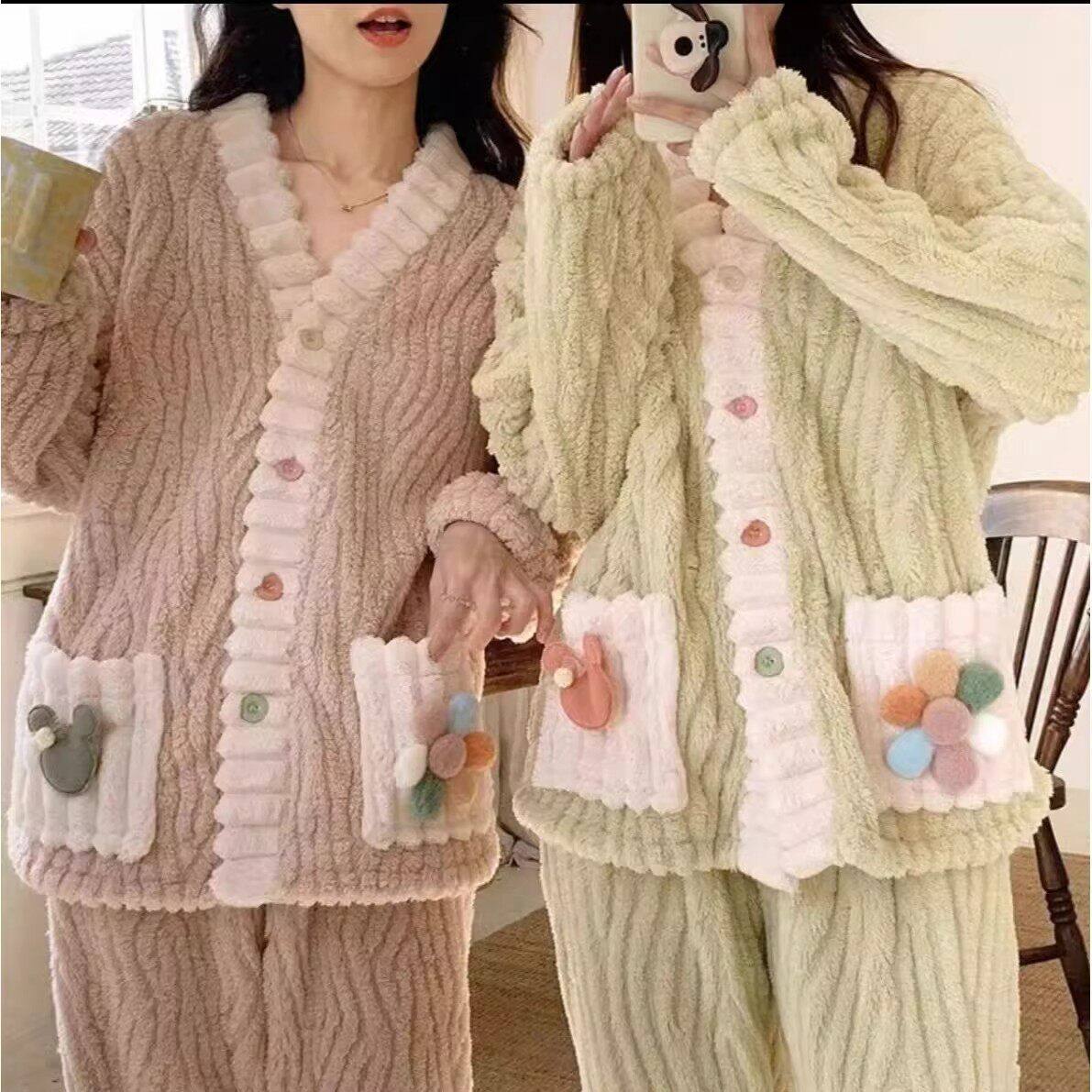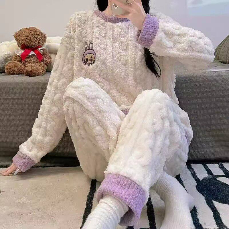 2025新款法兰绒提花毛绒家居服女士秋冬珊瑚绒睡衣套装德绒套装xx