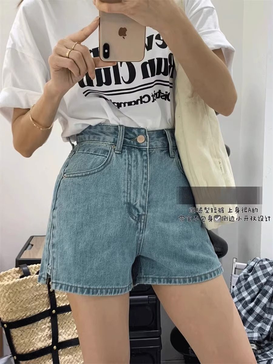 大码开叉牛仔短裤女夏季薄款胖mm宽松直筒裤辣妹高腰a字阔腿热裤