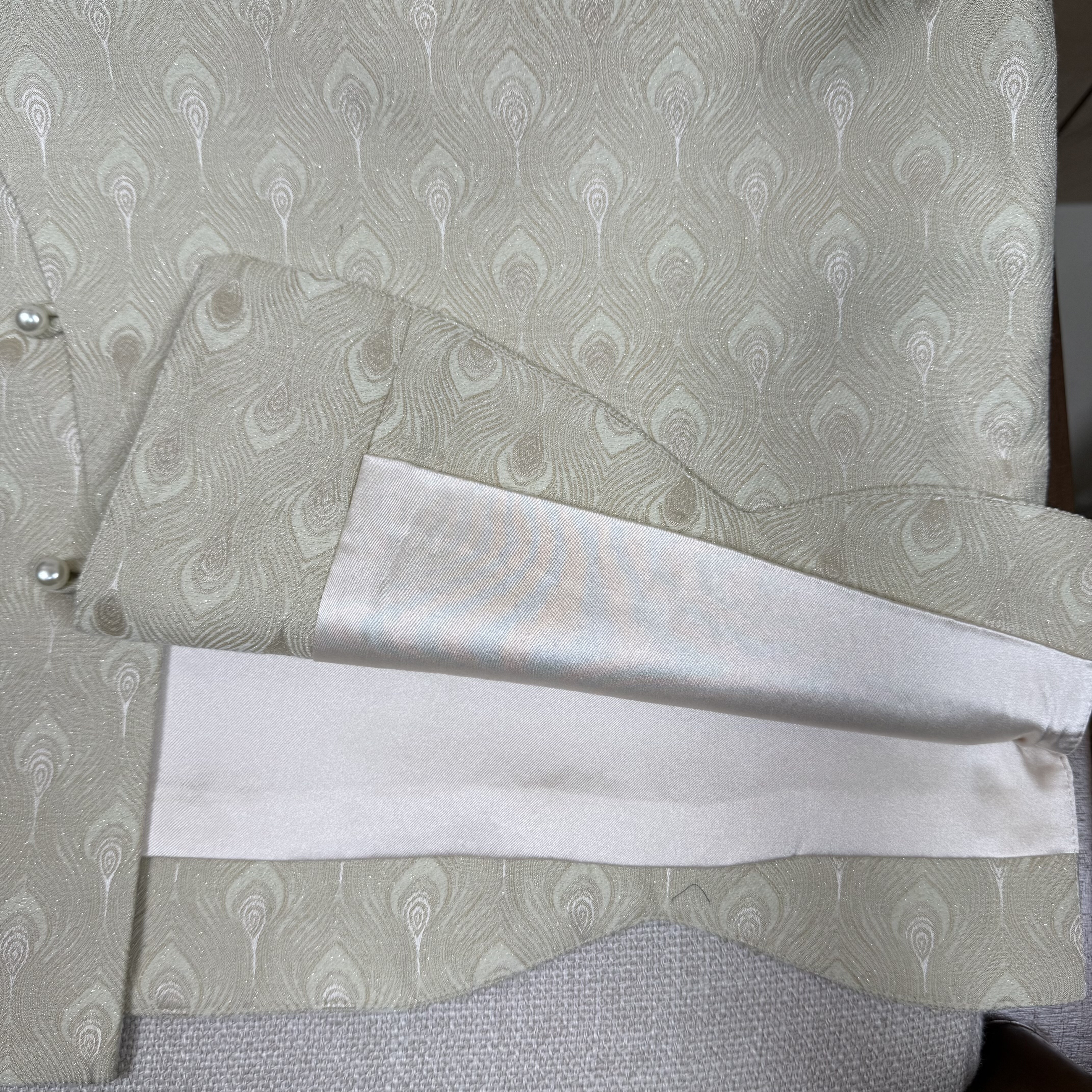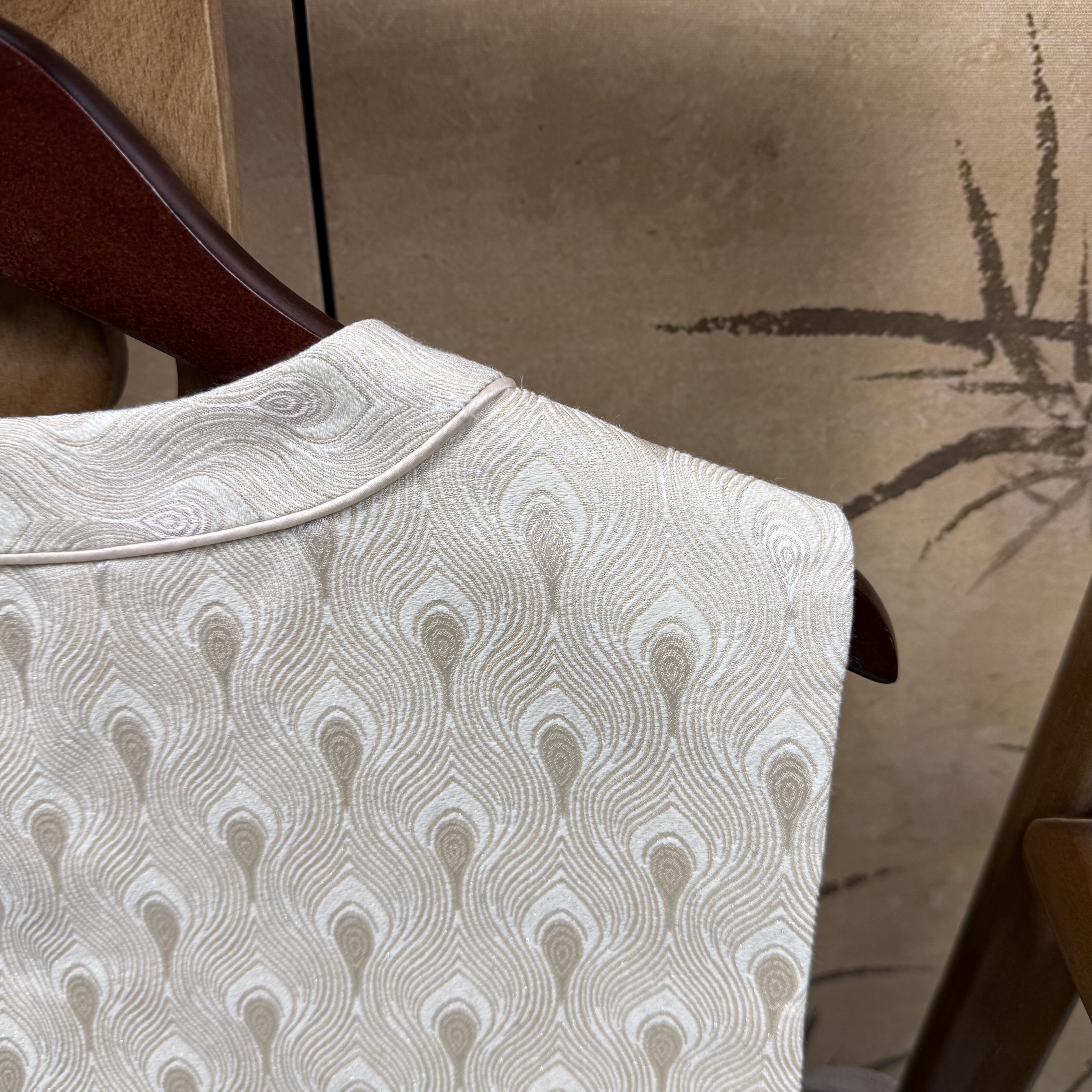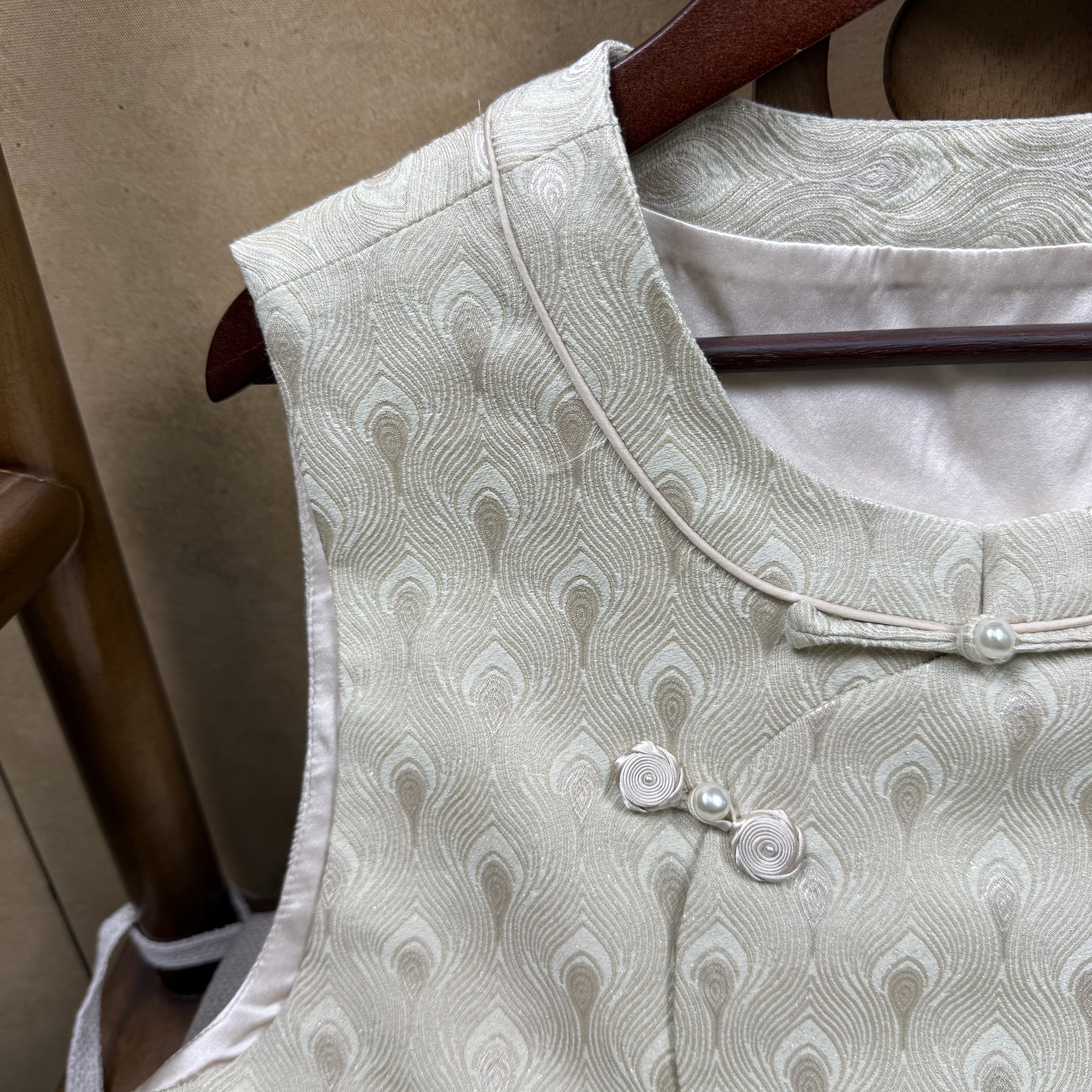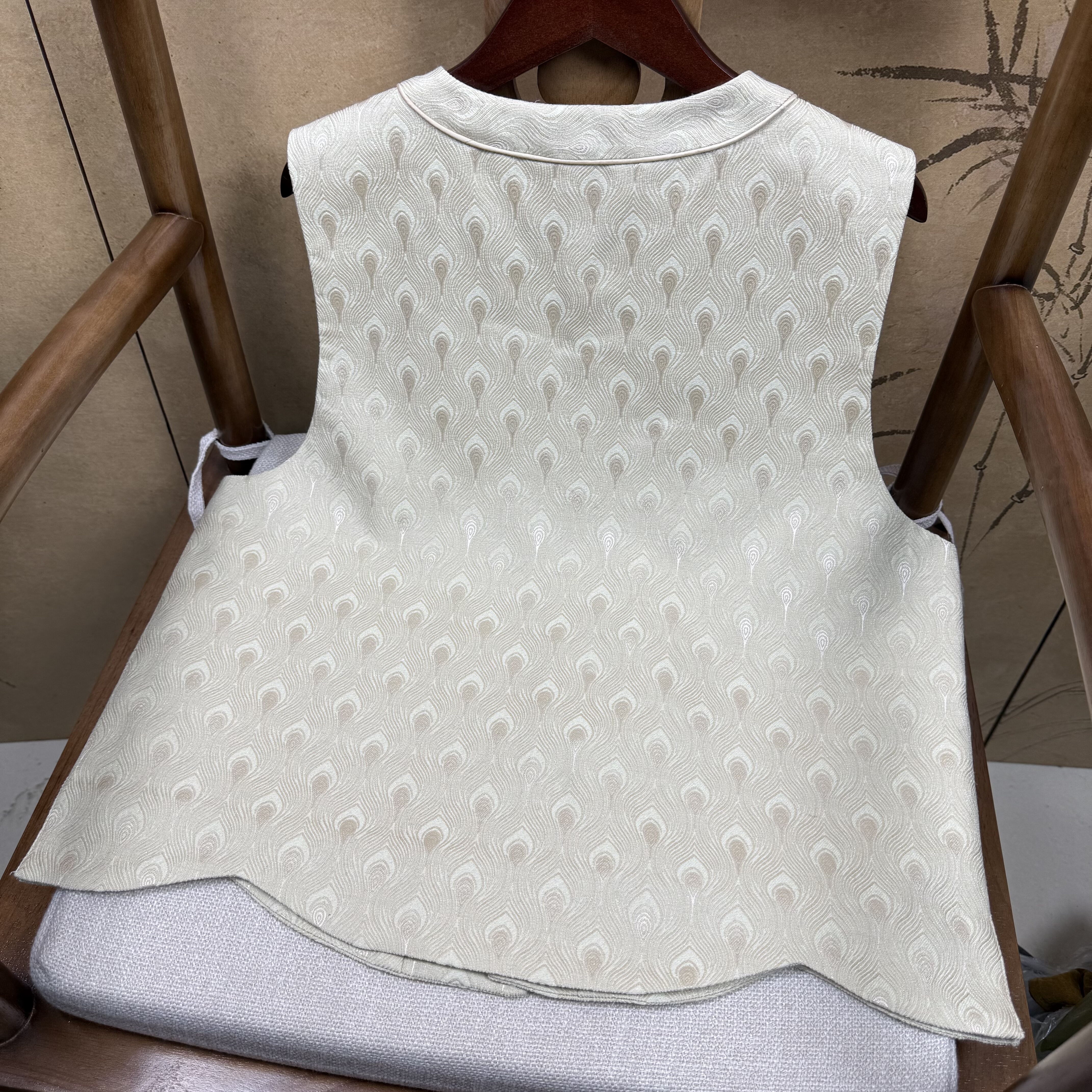 上久楷品牌丝羊毛50姆米米白色羽毛孔雀翎斜襟精致盘扣马甲国风