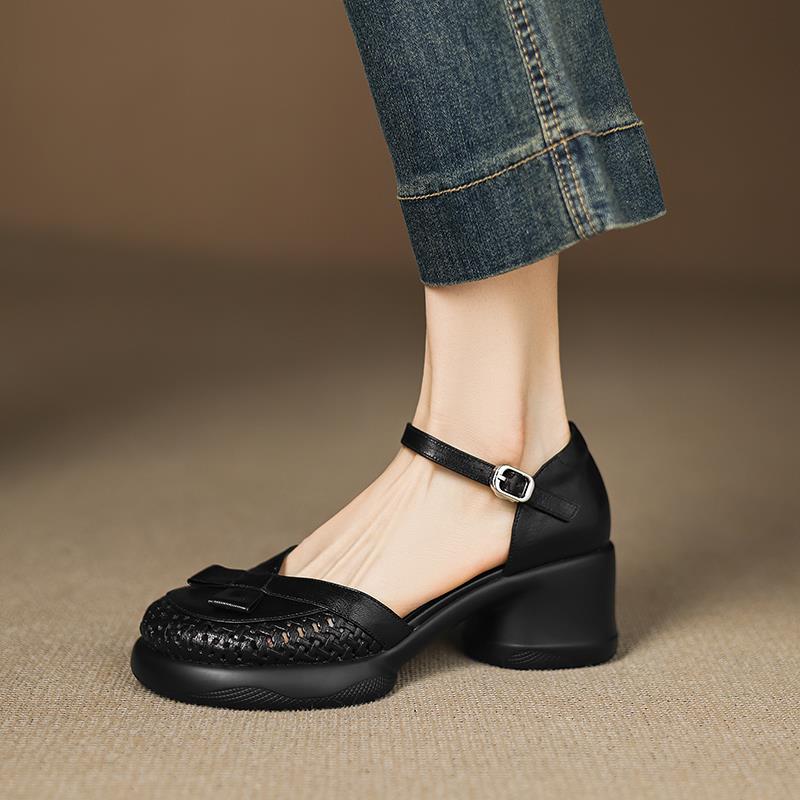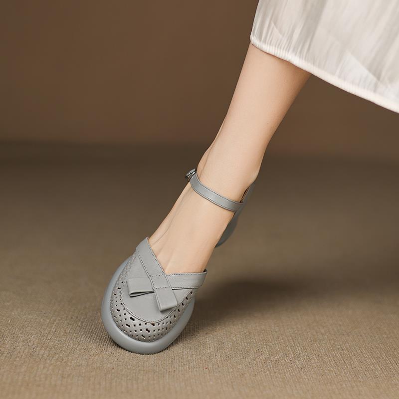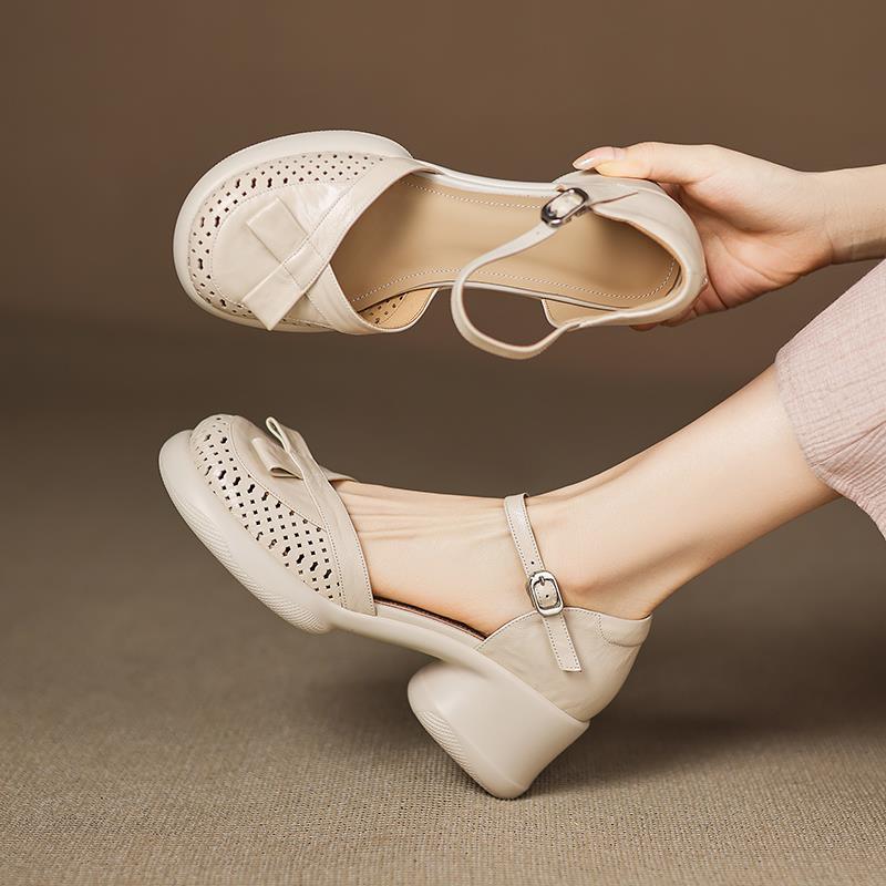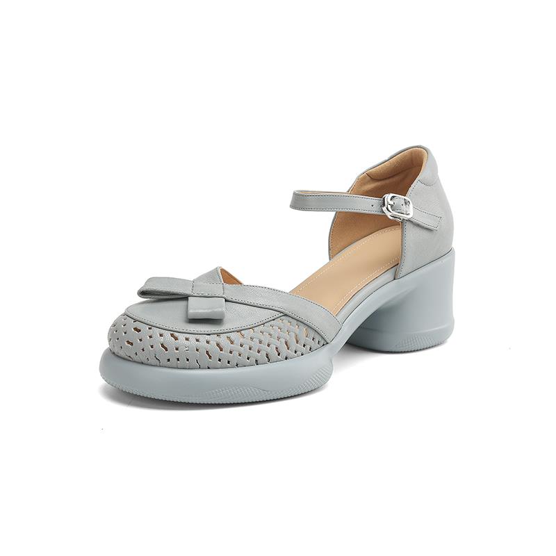 包头凉鞋女夏蝴蝶结厚底镂空圆头高跟鞋粗跟真皮软底蓝色40米白色