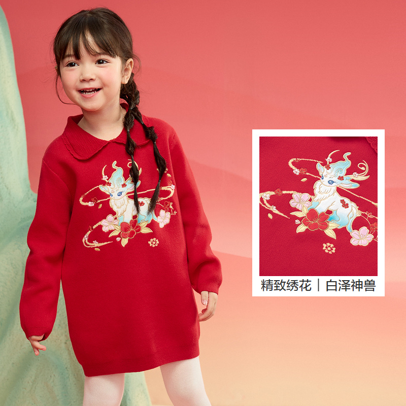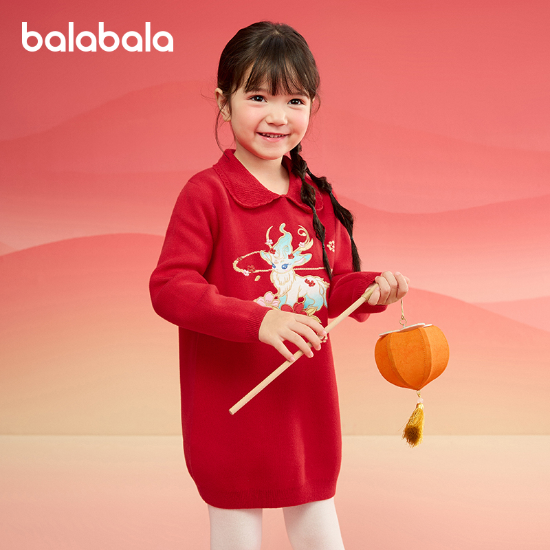 巴拉巴拉女童连衣裙儿童新年红色针织裙2025秋装新款宝宝裙子童装