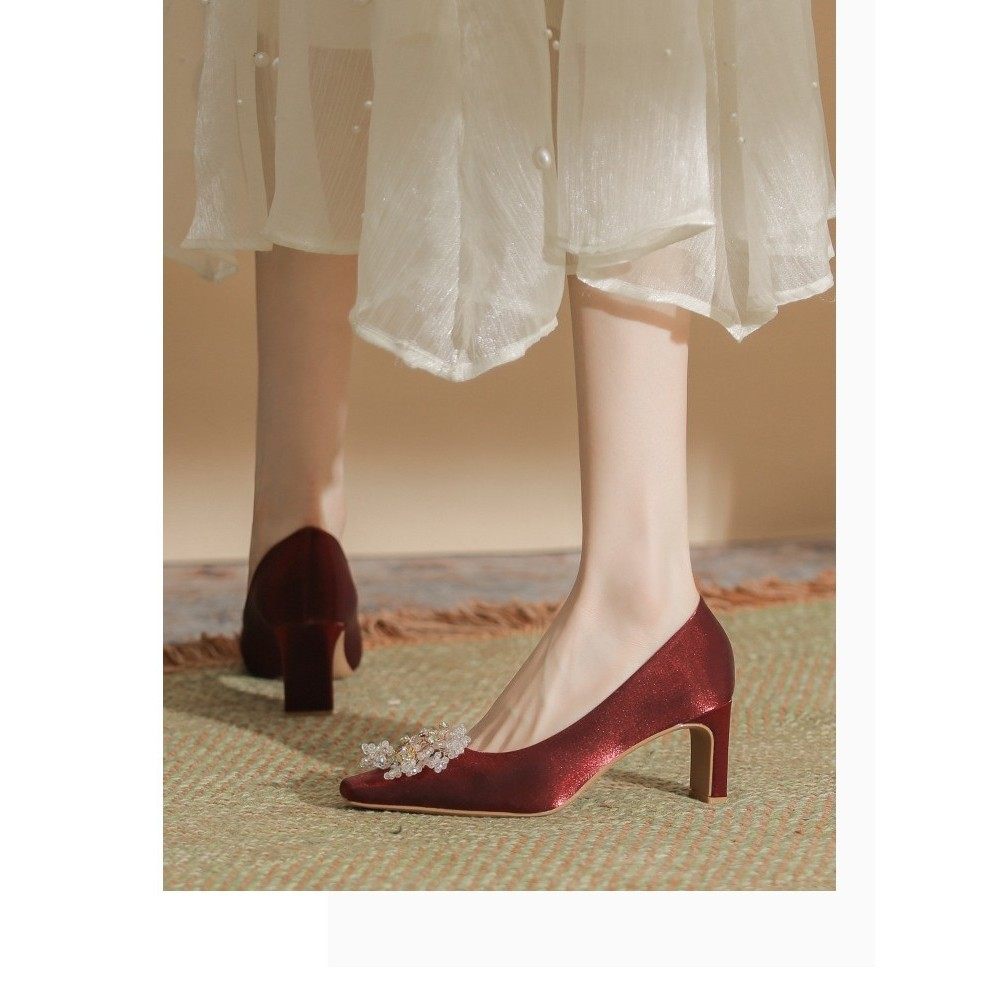 红色方头婚鞋女春秋新款粗跟高跟鞋秀禾不累脚中跟新娘单鞋子
