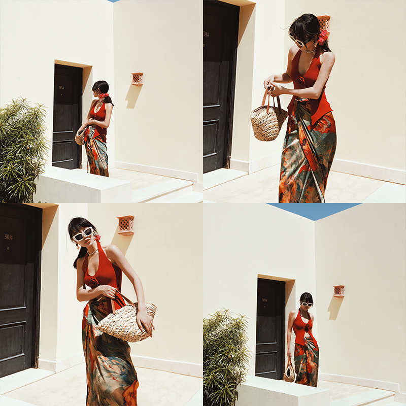 麦叙原创《慕夏》法式度假风油画印花缎面半身裙长裙一片式裹裙