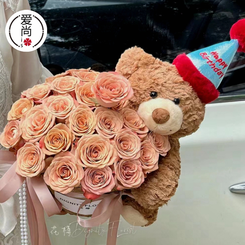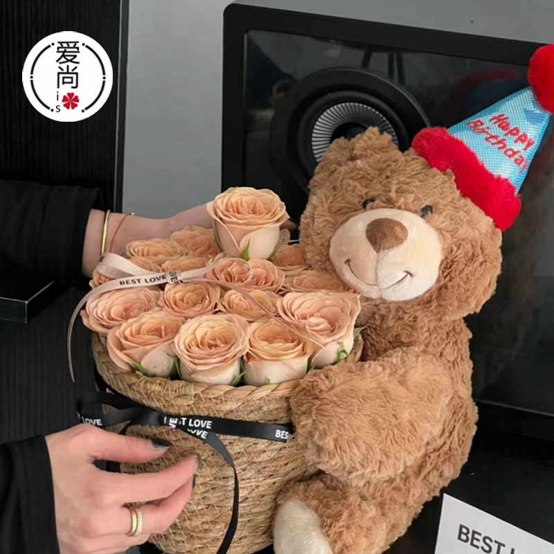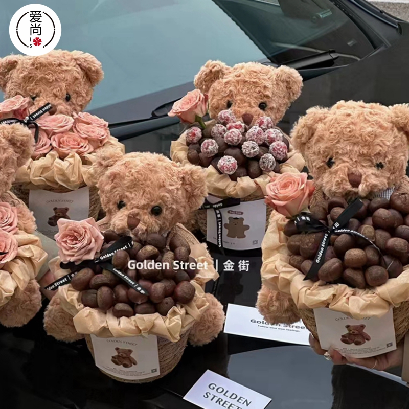 栗子熊抱抱桶仙子之吻草编花篮鲜花小熊板栗diy手工花店花艺资材