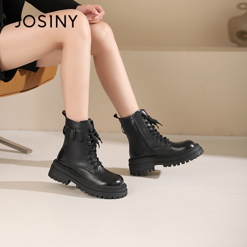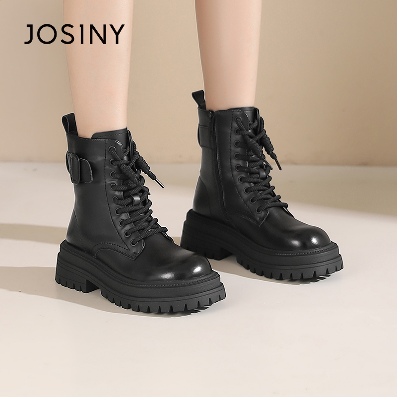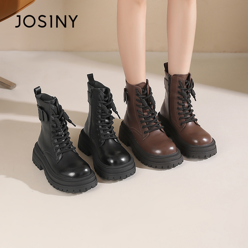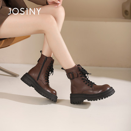 卓诗尼女鞋秋冬撤柜正品潮酷马丁靴舒适圆头斜侧一字皮带扣设计
