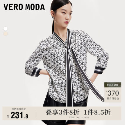 Vero Moda奥莱衬衫女秋冬新款V领七分袖字母印花气质丝带时尚上衣