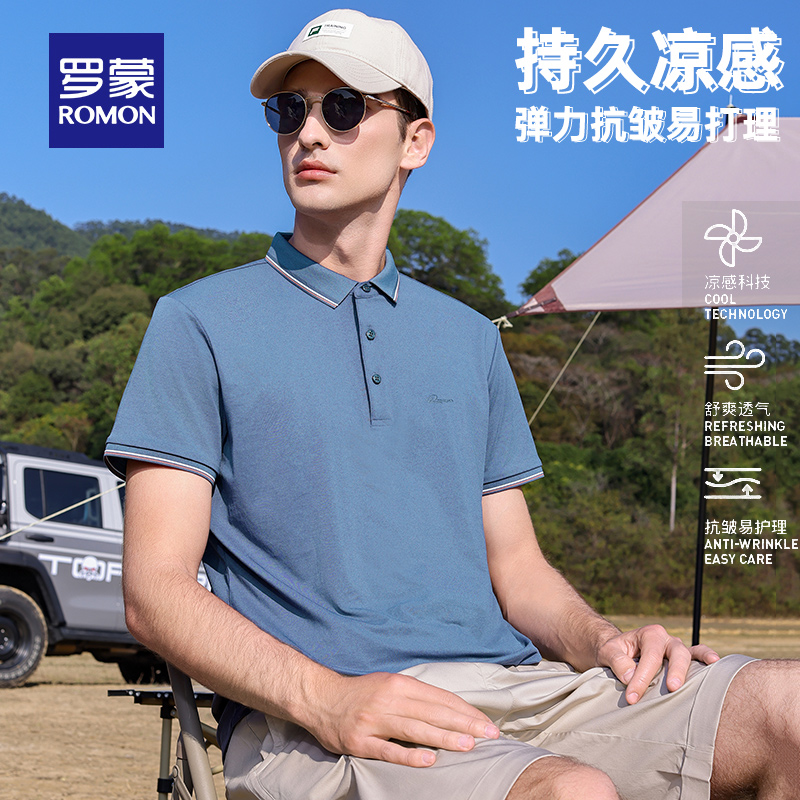 罗蒙短袖休闲抗菌凉感翻领T恤男