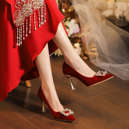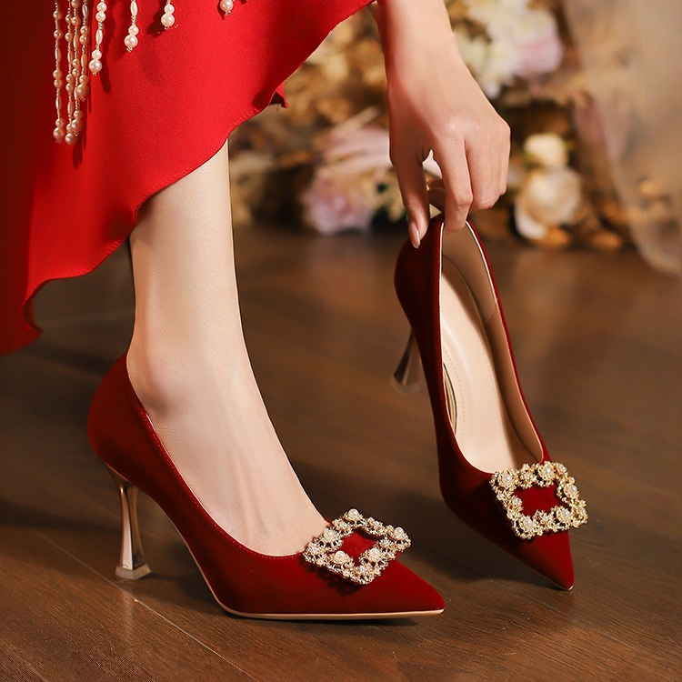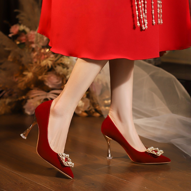 红色秀禾高跟鞋女中式绒面珍珠方扣新娘鞋秀禾敬酒服两穿复古婚鞋