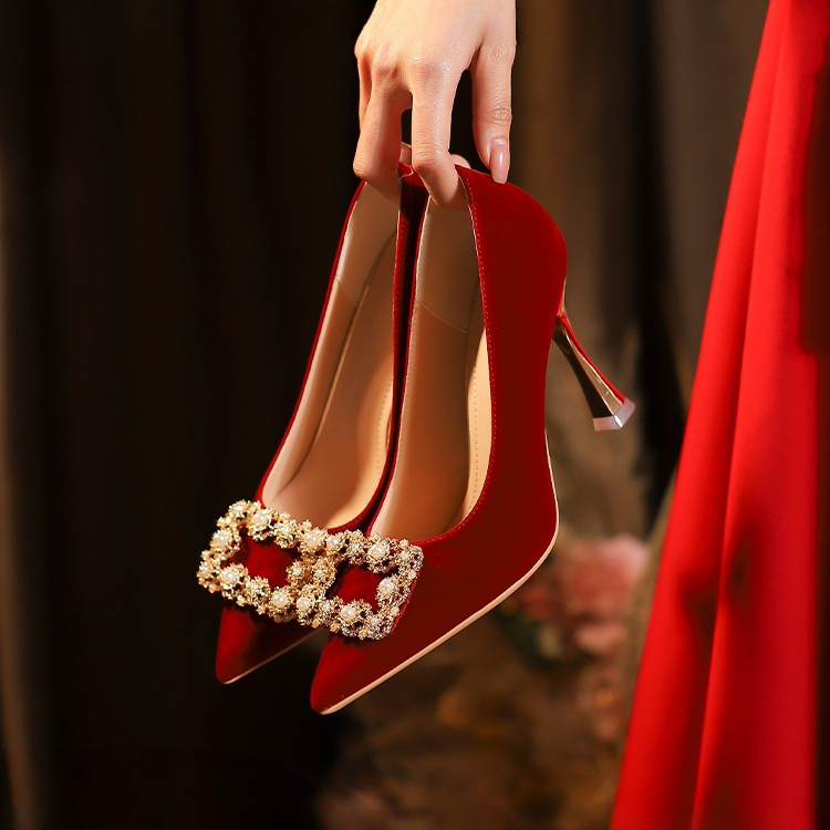 珍珠方扣复古红色婚鞋