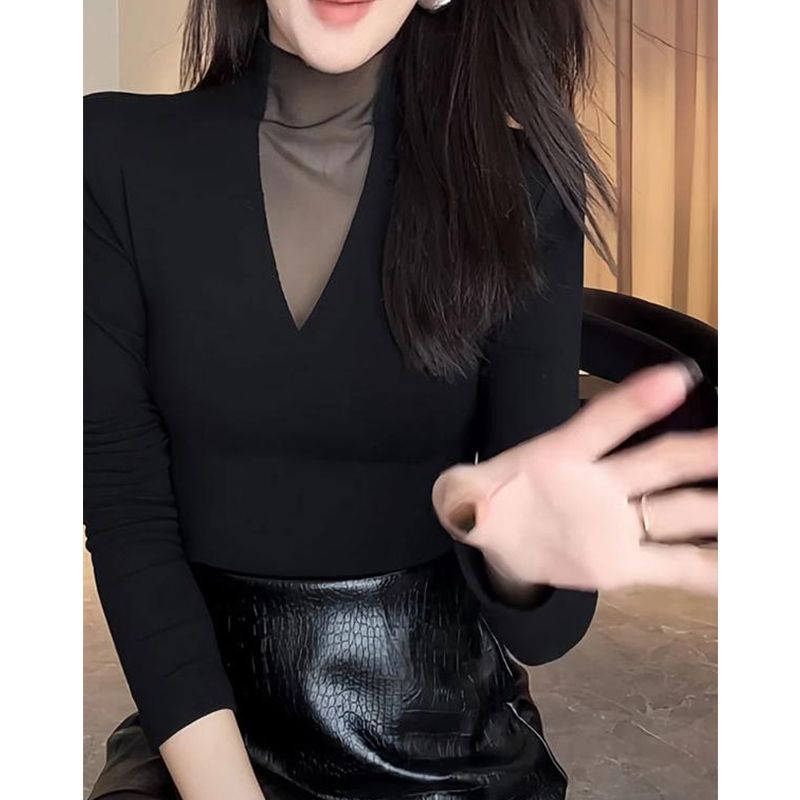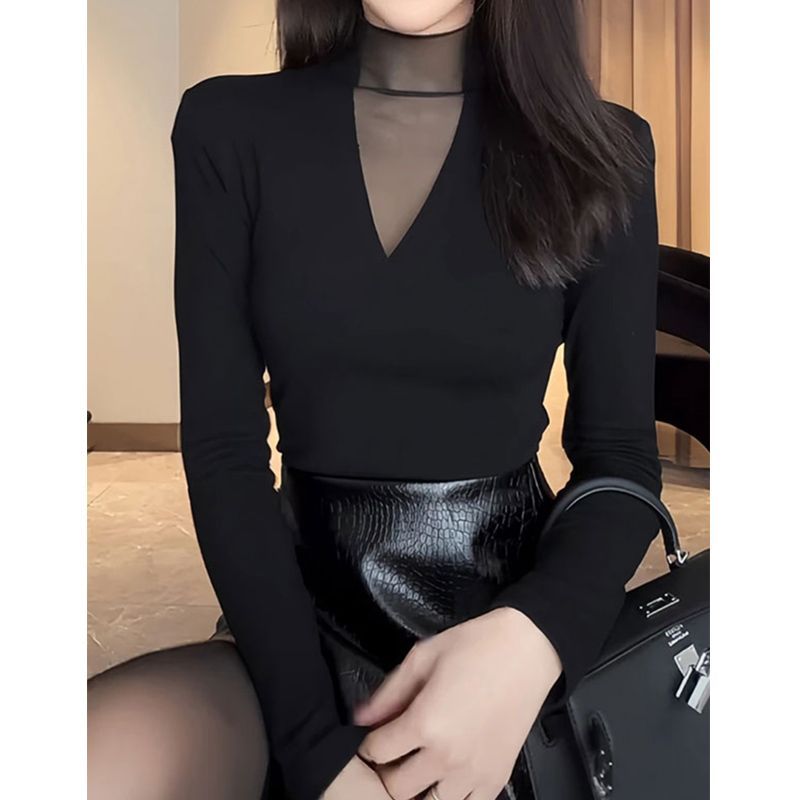 法式V领网纱拼接德绒长袖打底衫T恤女秋冬修身显瘦内搭可外穿上衣