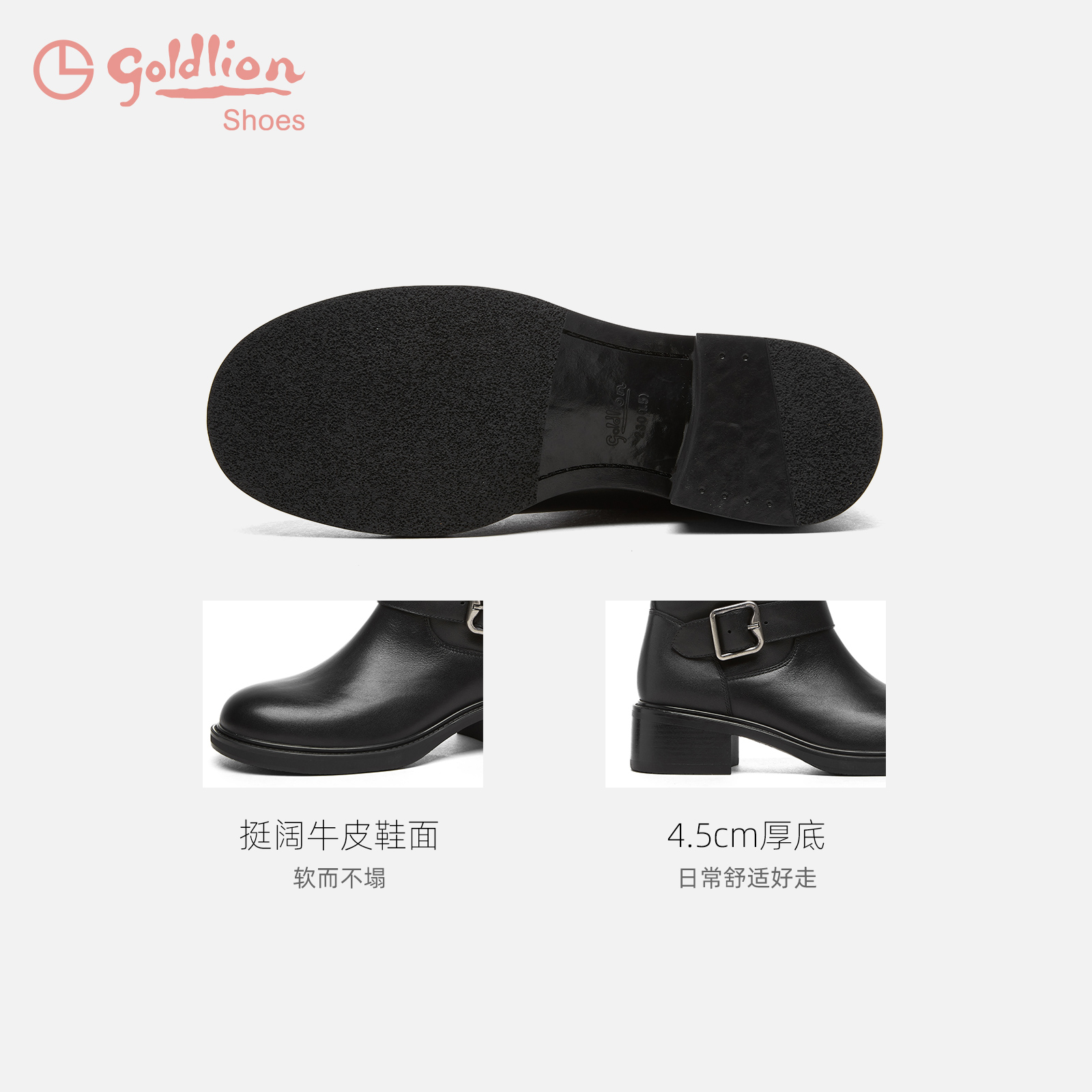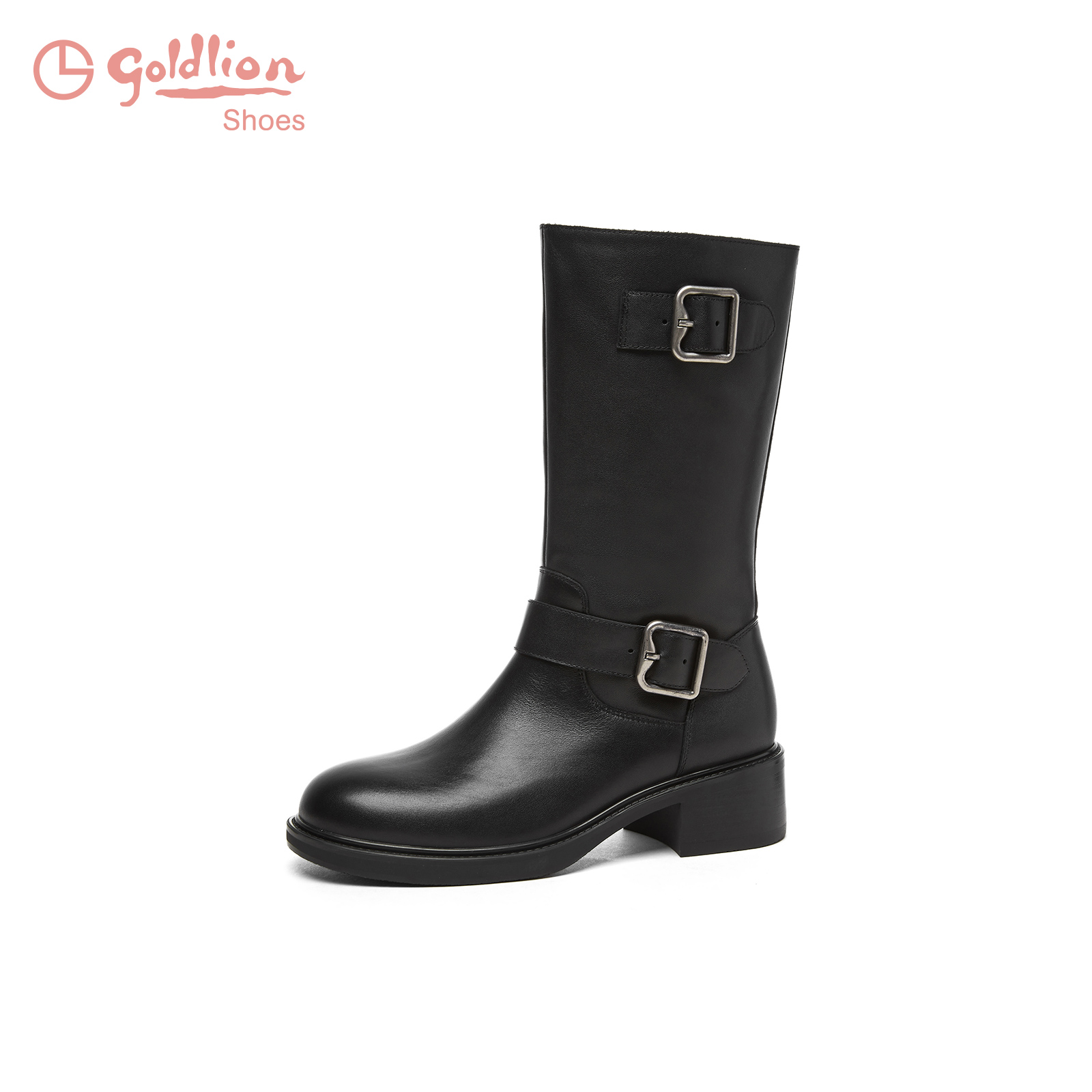 金利来女鞋2025秋冬新款皮带扣骑士靴女中筒粗跟机车靴黑色长靴女