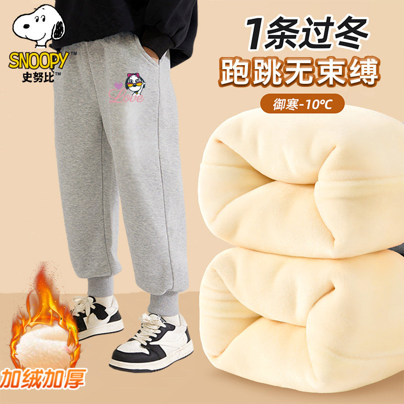 史努比2025新款儿童时尚百搭加绒卫裤男女童一体加绒长裤保暖裤子