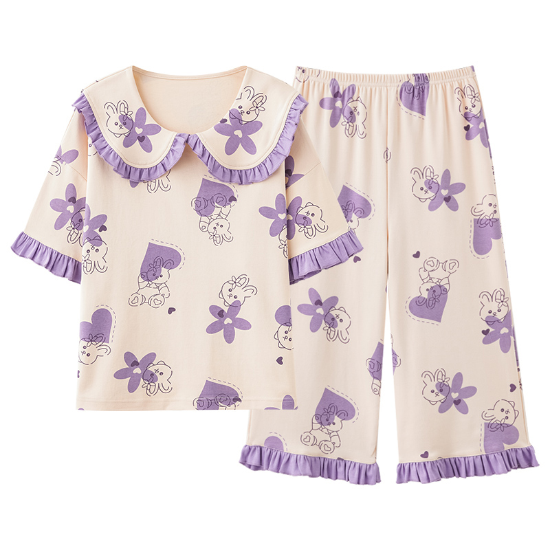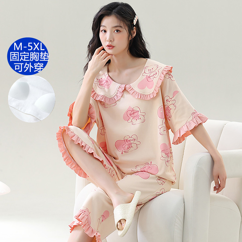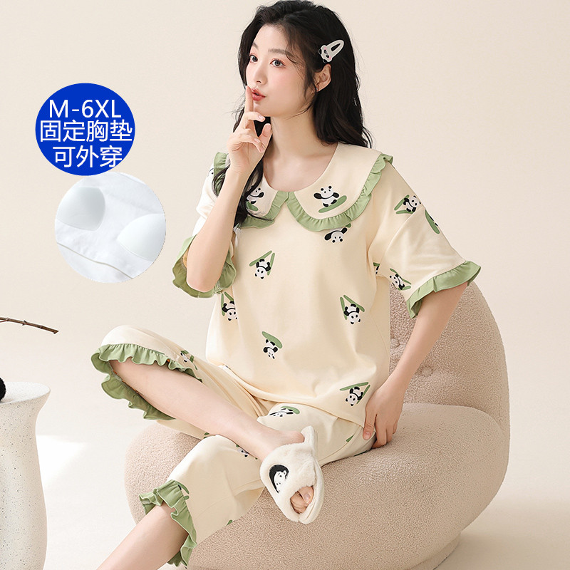 睡衣女夏季带胸垫纯棉短袖七分裤胖mm加肥加大码200斤家居服套装