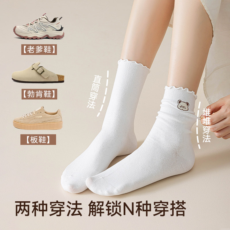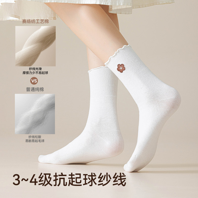 猫人白色纯棉袜子女10A抗菌防臭木耳边刺绣堆堆袜春秋纯色中筒袜